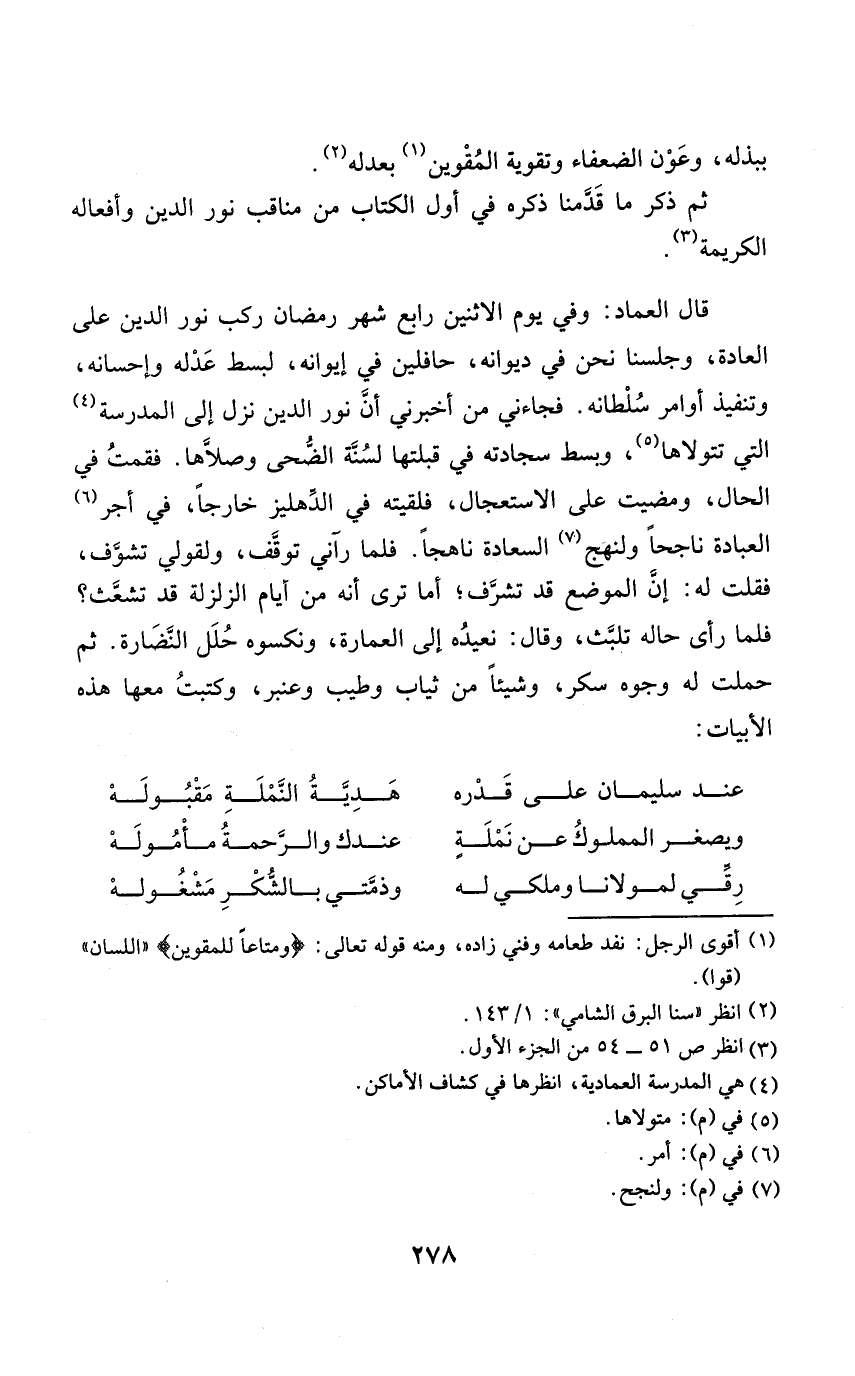 قَالَ الْعِمَاد وَفِي يَوْم الِاثْنَيْنِ رَابِع شهر رَمَضَان ركب نور الدّين على الْعَادة وَجَلَسْنَا نَحن فِي ديوانه حافلين فِي إيوانه لبسط عدله وإحسانه وتنفيذ أوَامِر سُلْطَانه فَجَاءَنِي من أَخْبرنِي أَن نور الدّين نزل إِلَى الْمدرسَة الَّتِي تتولاها وَبسط سجادته فِي قبلتها لسُنة الضُّحَى وصلاّها فَقُمْت من الْحَال ومضيت على الاستعجال فَلَقِيته فِي الدهليز خَارِجا فِي أجر الْعِبَادَة ناجحا ولنهج السَّعَادَة ناهجا فَلَمَّا رَآنِي توقف ولقولي تشوف فَقلت لَهُ إِن الْموضع قد تشرف أما ترى أَنه من أَيَّام الزلزلة قد تشعث فَلَمَّا رأى حَاله تلبث وَقَالَ نعيده إِلَى الْعِمَارَة ونكسوه حلل النضارة ثمَّ حملت لَهُ وُجُوه سكر وشيئا من ثِيَاب وَطيب وَعَنْبَر وكتبت مَعهَا هَذِه الأبيات