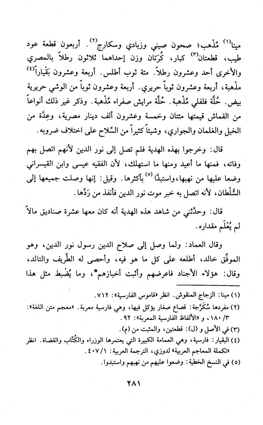 قَالَ وَخَرجُوا بِهَذِهِ الْهَدِيَّة فَلم تصل إِلَى نور الدّين لأَنهم أتصل بهم وَفَاته فَمِنْهَا مَا أُعِيد وَمِنْهَا مَا اسْتهْلك لِأَن الْفَقِيه عِيسَى وَابْن القيسراني وضعا عَلَيْهَا من نهبها واستَّبَدا بأكثرها وَقيل إِنَّهَا وصلت جَمِيعهَا إِلَى السُّلْطَان لِأَنَّهُ اتَّصل بِهِ خبر موت نور الدّين فأنفذ من ردّها
