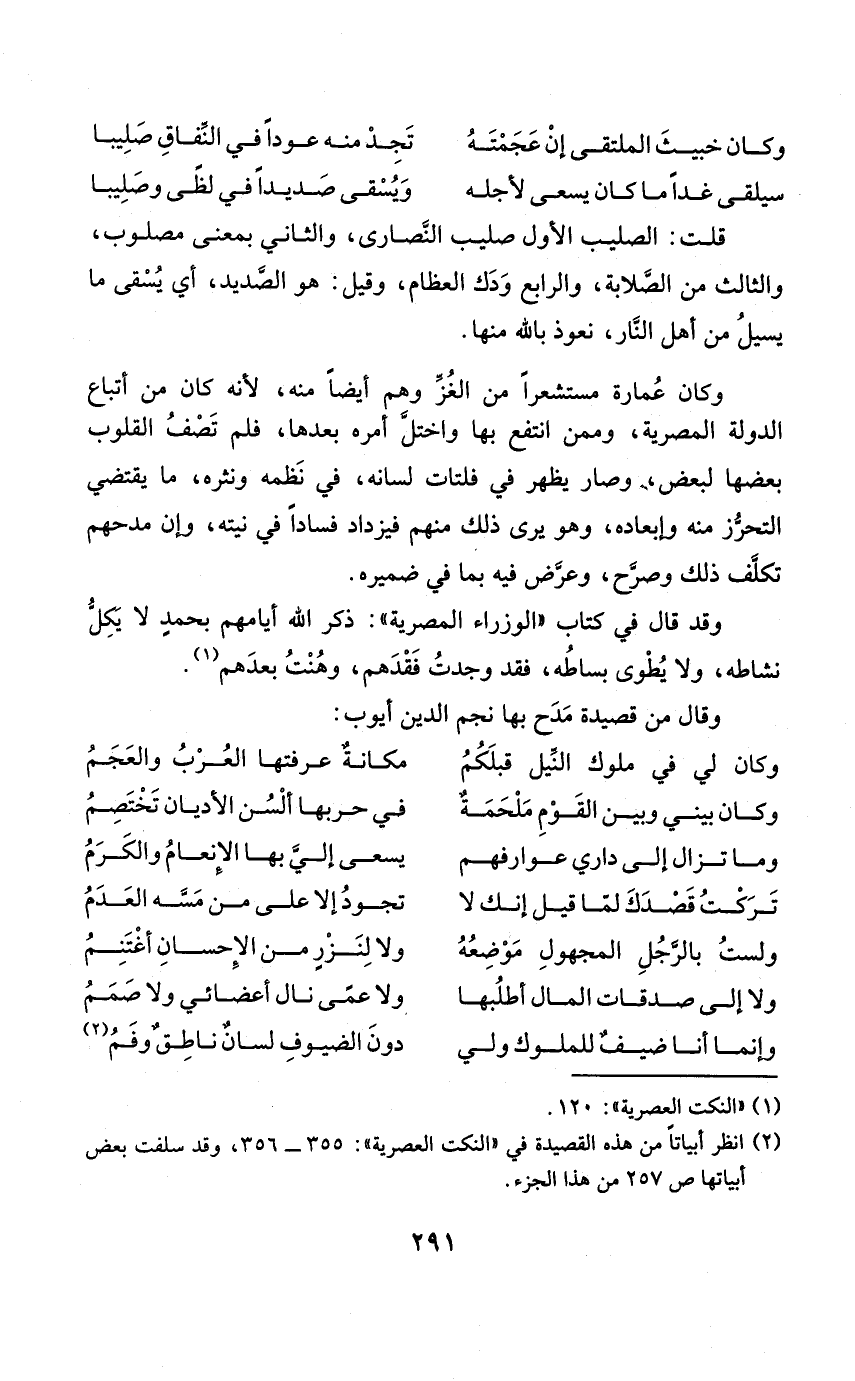 وَكَانَ عُمارة مستشعراً من الغز وهم أَيْضا مِنْهُ لِأَنَّهُ كَانَ من أَتبَاع الدولة المصرية وَمِمَّنْ انْتفع بهَا واختل أمره بعْدهَا فَلم تصف الْقُلُوب بَعْضهَا لبَعض وَصَارَ يظْهر فِي فلتات لِسَانه فِي نظمه ونثره مَا يَقْتَضِي التَّحَرُّز مِنْهُ وإبعاده وَهُوَ يرى ذَلِك مِنْهُم فَيَزْدَاد فَسَادًا فِي نِيَّته وَإِن مدحهم تكلّف ذَلِك وصرّح وعرّض فِيهِ بِمَا فِي ضَمِيره