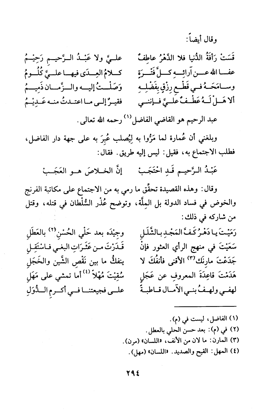 (قست رأفة الدُّنْيَا فَلَا الدَّهْر عاطف ... عليّ وَلَا عبد الرَّحِيم رَحِيم)
