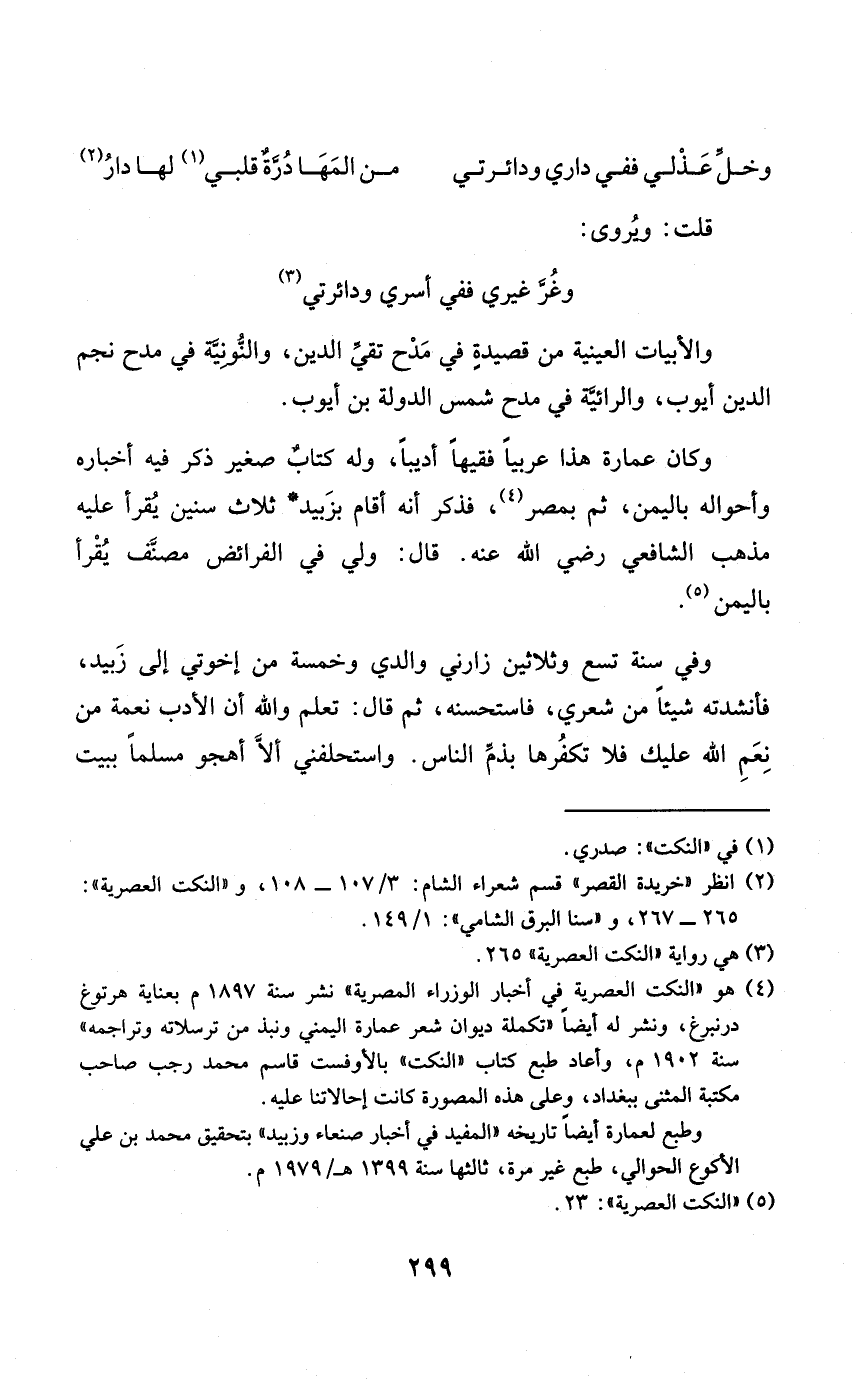 وَكَانَ عمَارَة هَذَا عَرَبيا فَقِيها أديباً وَله كتاب صَغِير ذكر فِيهِ أخباره وأحواله بِالْيمن ثمَّ بِمصْر فَذكر أَنه أَقَامَ بزبيد ثَلَاث سِنِين يقْرَأ عَلَيْهِ مَذْهَب الشَّافِعِي رَضِي الله عَنهُ قَالَ ولى فِي الْفَرَائِض مُصَنف يقْرَأ بِالْيمن