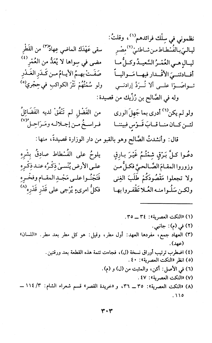 (لياليّ بالفسطاط من شاطئي مصر ... سقى عَهْدك الْمَاضِي عهاد من الْقطر)