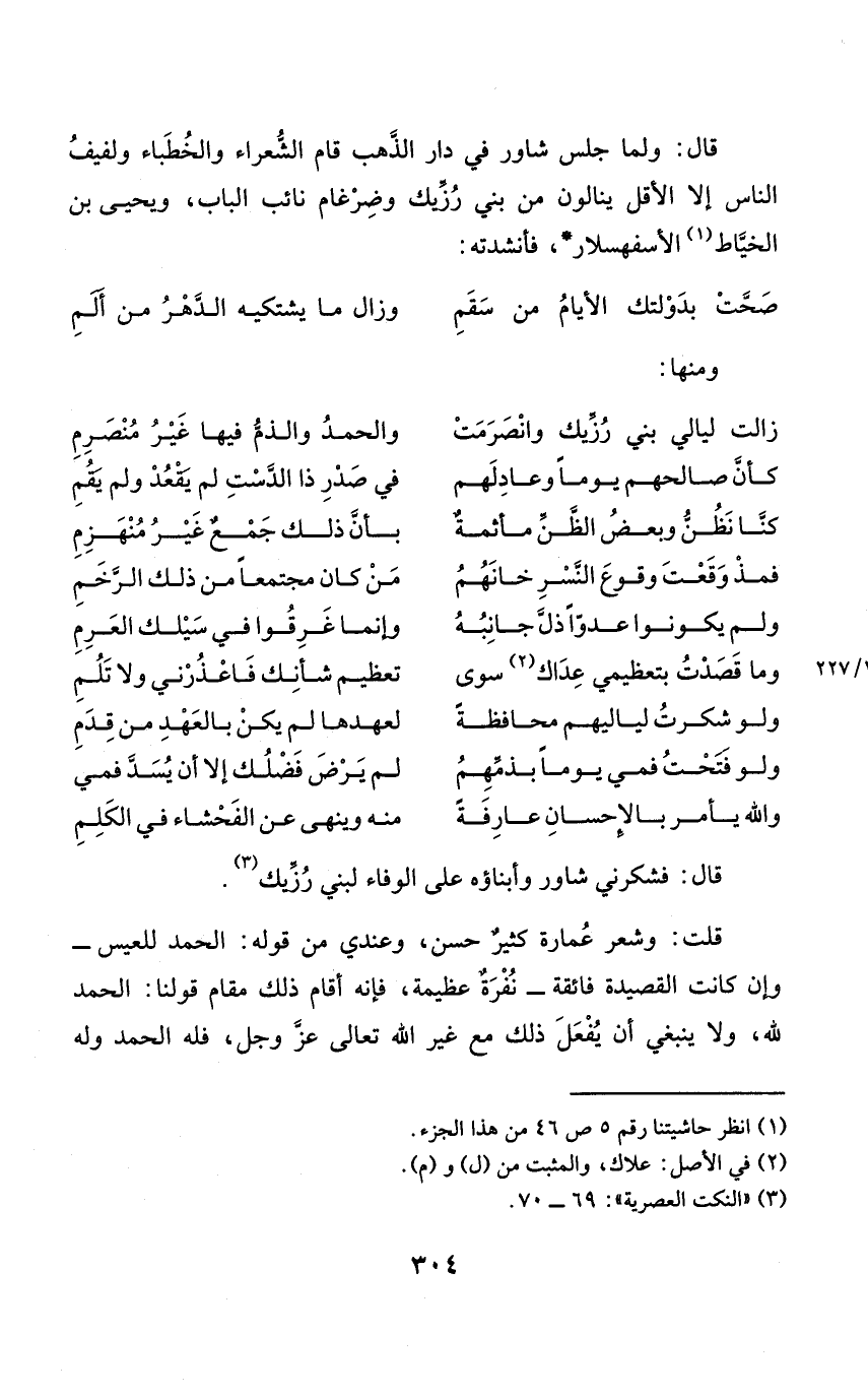 قلت وَشعر عمَارَة كثير حسن وَعِنْدِي من قَوْله الْحَمد للعيس وَإِن كَانَت القصيدة فائقة نفرة عَظِيمَة فَإِنَّهُ أَقَامَ ذَلِك مقَام قَوْلنَا الْحَمد لله وَلَا يَنْبَغِي أَن يفعل ذَلِك مَعَ غير الله تَعَالَى عزّ وَجل فَلهُ الْحَمد وَله