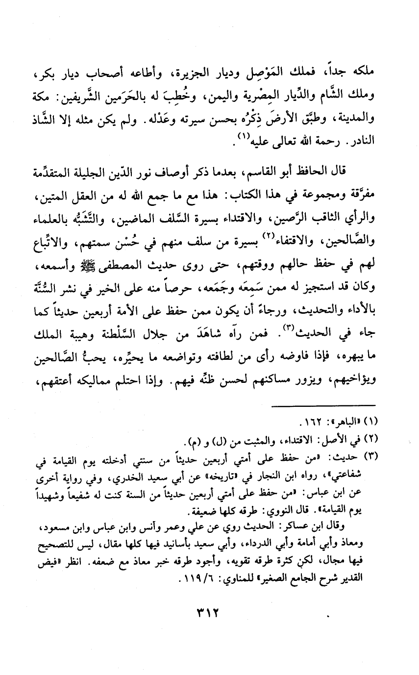 قَالَ الْحَافِظ أَبُو الْقَاسِم بَعْدَمَا ذكر أَوْصَاف نور الدّين الجليلة الْمُتَقَدّمَة مفرقة ومجموعة فِي هَذَا الْكتاب هَذَا مَعَ مَا جمع الله لَهُ من الْعقل المتين والرأي الثاقب الرصين والاقتداء بسيرة السّلف الماضين والتشبه بالعلماء وَالصَّالِحِينَ والاقتفاء بسيرة من سلف مِنْهُم فِي حسن سمتهم والاتباع لَهُم فِي حفظ حَالهم ووقتهم حَتَّى روى حَدِيث الْمُصْطَفى صلى الله عَلَيْهِ وَسلم وأسمعه وَكَانَ قد استجيز لَهُ مِمَّن سَمعه وَجمعه حرصا مِنْهُ على الْخَيْر فِي نشر السّنة بِالْأَدَاءِ والتحديث ورجاء أَن يكون مِمَّن حفظ على الْأمة أَرْبَعِينَ حَدِيثا كَمَا جَاءَ فِي الحَدِيث فَمن رَآهُ شَاهد من جلال السلطنة وهيبة الْملك مَا يبهره فَإِذا فاوضه رأى من لطافته وتواضعه مَا يحيره يحب الصَّالِحين ويؤاخيهم ويزور مساكنهم لحسن ظَنّه فيهم وَإِذا احْتَلَمَ مماليكه أعتقهم