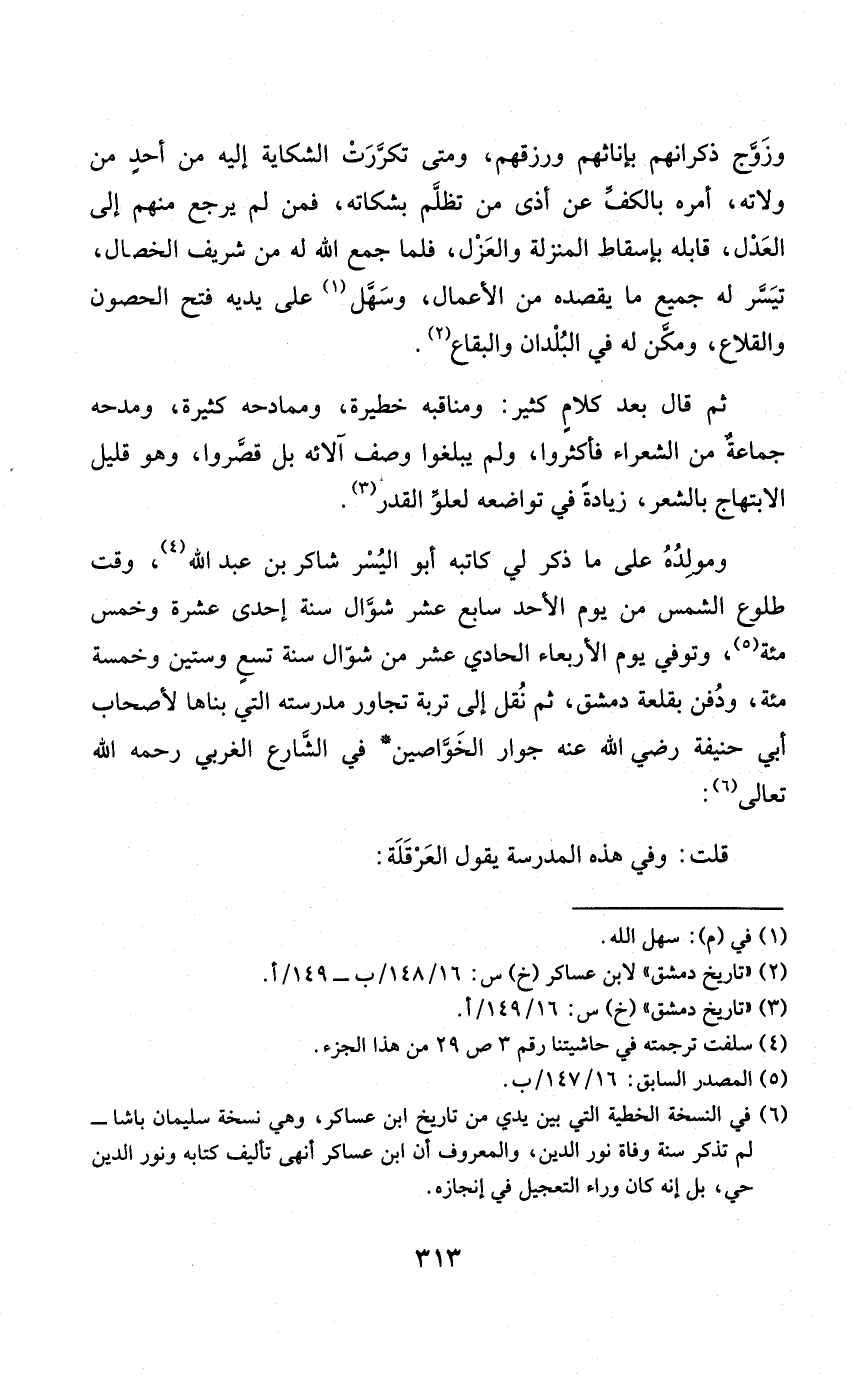 ومولده على مَا ذكر لي كَاتبه أَبُو الْيُسْر شَاكر بن عبد الله وَقت طُلُوع الشَّمْس من يَوْم الْأَحَد سَابِع عشر شَوَّال سنة إِحْدَى عشرَة وَخمْس مئة وَتُوفِّي يَوْم الْأَرْبَعَاء الْحَادِي عشر من شَوَّال سنة تسع وَسِتِّينَ وَخَمْسَة مئة وَدفن بقلعة دمشق ثمَّ نقل إِلَى تربة تجاور مدرسته الَّتِي بناها لأَصْحَاب أبي حنيفَة رَضِي الله عَنهُ جوَار الخواصين فِي الشَّارِع الغربي رَحمَه الله تَعَالَى