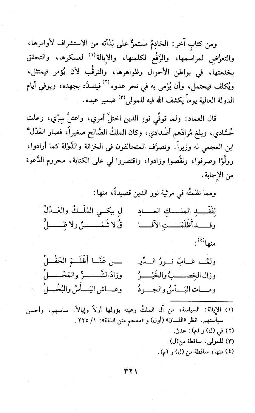 (وَلما غَابَ نور الدّين ... عَنَّا أظلم الحفل)
