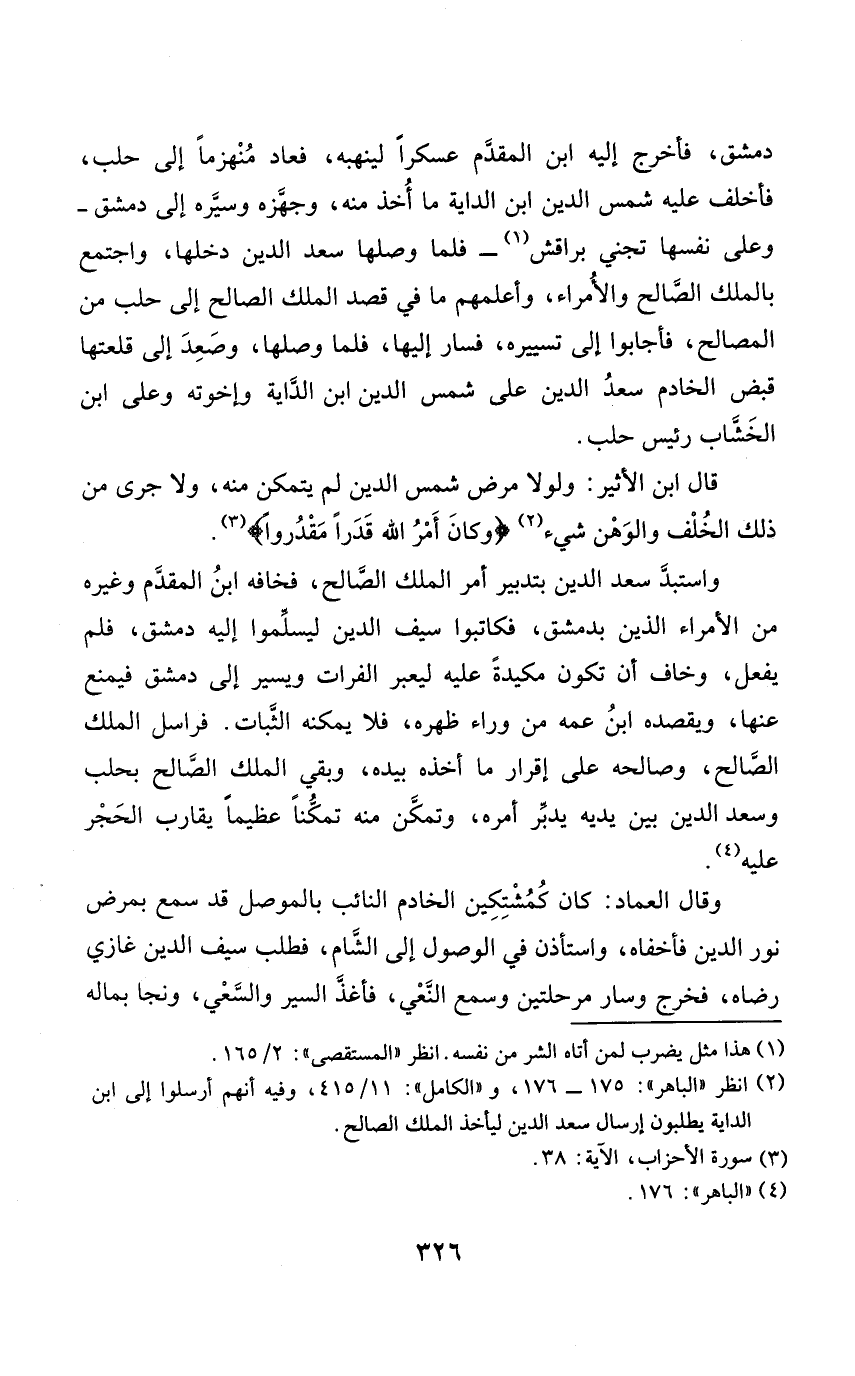 دمشق فَأخْرج إِلَيْهِ ابْن الْمُقدم عسكرا لينهبه فَعَاد مُنهزما إِلَى حلب فأخلف عَلَيْهِ شمس الدّين ابْن الداية مَا أَخذ مِنْهُ وجهزه وسيره إِلَى دمشق وعَلى نَفسهَا تجني براقش فَلَمَّا وَصلهَا سعد الدّين دَخلهَا وَاجْتمعَ بِالْملكِ الصَّالح والأمراء وأعلمهم مَا فِي قصد الْملك الصَّالح إِلَى حلب من الْمصَالح فَأَجَابُوا إِلَى تسييره فَسَار إِلَيْهَا فَلَمَّا وَصلهَا وَصعد إِلَى قلعتها قبض الْخَادِم سعد الدّين على شمس الدّين ابْن الداية وَإِخْوَته وعَلى ابْن الخشاب رَئِيس حلب