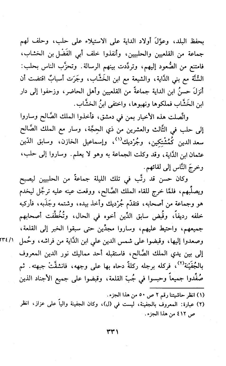 بِحِفْظ الْبَلَد وعول أَوْلَاد الداية على الِاسْتِيلَاء على حلب وَحلف لَهُم جمَاعَة من القلعيين والحلبيين وأنفذوا خلف أبي الْفضل بن الخشاب فَامْتنعَ من الصعُود إِلَيْهِم وترددت بَينهم الرسَالَة وتحزب النَّاس بحلب السّنة مَعَ بني الداية والشيعة مَعَ أبن الخشاب وَجَرت أَسبَاب اقْتَضَت أَن أنزل حسن ابْن الداية جمَاعَة من القلعيين وَأهل الْحَاضِر وزحفوا إِلَى دَار ابْن الخشاب فملكوها ونهبوها واختفى ابْن الخشاب