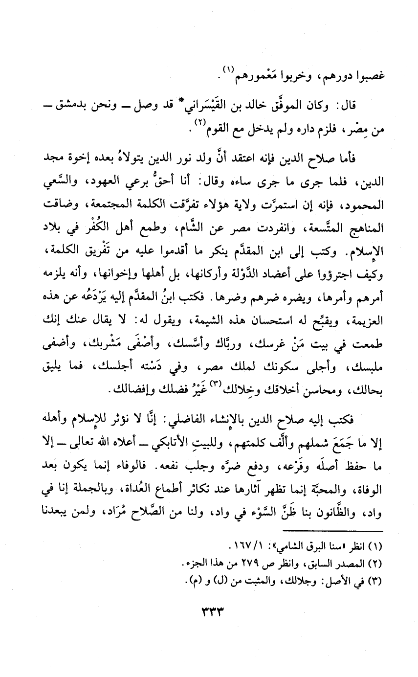 فَكتب إِلَيْهِ صَلَاح الدّين بالإنشاء الفاضلي إِنَّا لانؤثر لِلْإِسْلَامِ وَأَهله إِلَّا مَا جمع شملهم وَألف كلمتهم وللبيت الأتابكي أَعْلَاهُ الله تَعَالَى إِلَّا مَا حفظ أَصله وفرعه وَدفع ضرّه وجلب نَفعه فالوفاء إِنَّمَا يكون بعد الْوَفَاة والمحبة إِنَّمَا تظهر آثارها عِنْد تكاثر أطماع العداة وَبِالْجُمْلَةِ إِنَّا فِي وَاد والظانون بِنَا ظن السوء فِي وَاد وَلنَا من الصّلاح مُرَاد وَلمن يبعدنا