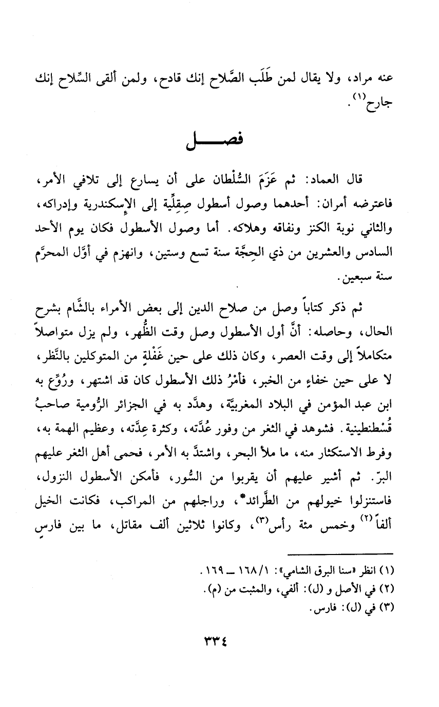 ثمَّ ذكر كتابا وصل من صَلَاح الدّين إِلَى بعض الْأُمَرَاء بِالشَّام بشرح الْحَال وَحَاصِله أَن أول الأسطول وصل وَقت الظّهْر وَلم يزل متواصلا متكاملا إِلَى وَقت الْعَصْر وَكَانَ ذَلِك على حِين غَفلَة من المتوكلين بِالنّظرِ لَا على حِين خَفَاء من الْخَبَر فَأمر ذَلِك الأسطول كَانَ قد أشتهر ورُوع بِهِ ابْن عبد الْمُؤمن فِي الْبِلَاد المغربية وهدد بِهِ فِي الجزائر الرومية صَاحب قسطنطينية فشوهد فِي الثغر من وفور عُدّته وَكَثْرَة عدَّته وعظيم الهمّة بِهِ وفرط الاستكثار مِنْهُ مَا مَلأ الْبَحْر وَاشْتَدَّ بِهِ الْأَمر فحمى أهل الثغر عَلَيْهِم البّر ثمَّ أُشير عَلَيْهِم أَن يقربُوا من السّور فَأمكن الأسطول النُّزُول فاستنزلوا خيولهم من الطرائد وراجلهم من المراكب فَكَانَت الْخَيل ألفا وَخمْس مئة رَأس وَكَانُوا ثَلَاثِينَ ألف مقَاتل مَا بَين فَارس