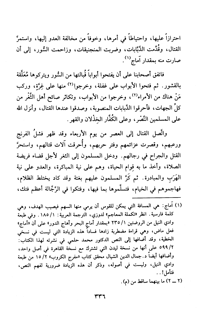 احْتِرَازًا عَلَيْهَا واحتياطا فِي أمرهَا وخوفا من مُخَالفَة الْعَدو إِلَيْهَا وَاسْتمرّ الْقِتَال وقدمت الدبابات وَضربت المنجنيقات وزاحمت السّور إِلَى أَن صَارَت مِنْهُ بِمِقْدَار أماج
