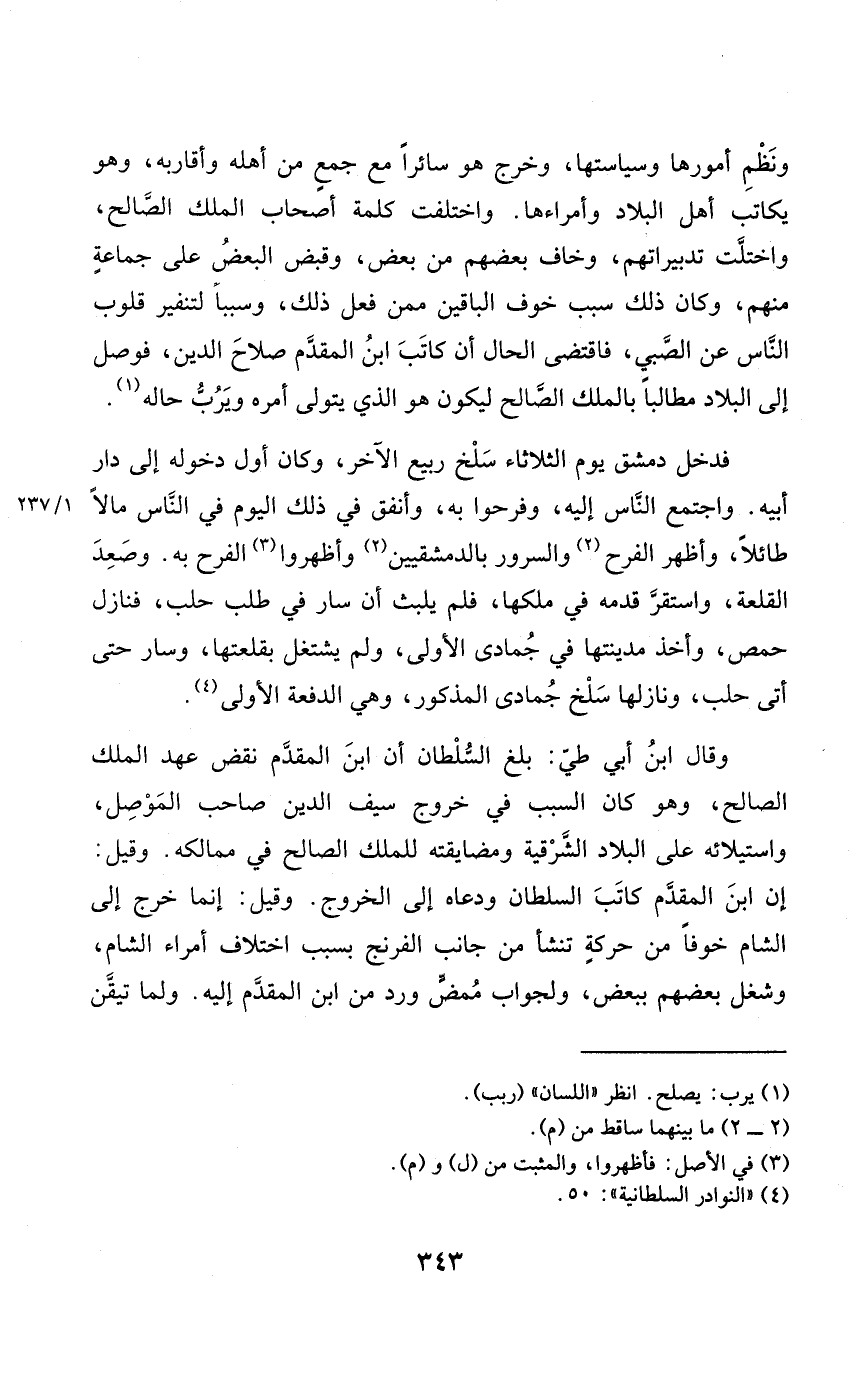 ونظم أمورها وسياستها وَخرج هُوَ سائرا مَعَ جمع من أَهله وأقاربه وَهُوَ يُكَاتب أهل الْبِلَاد وأمراءها وَاخْتلفت كلمة اصحاب الْملك الصَّالح واختلت تدبيراتهم وَخَافَ بَعضهم من بعض وَقبض الْبَعْض على جمَاعَة مِنْهُم وَكَانَ ذَلِك سَبَب خوف البَاقِينَ مِمَّن فعل ذَلِك وسببا لتنفير قُلُوب النّاس عَن الصَّبِي فَاقْتضى الْحَال أَن كَاتب ابنُ الْمُقدم صَلَاح الدّين فوصل إِلَى الْبِلَاد مطالبا بِالْملكِ الصَّالح ليَكُون هُوَ الَّذِي يتَوَلَّى أمره ويربّ حَاله