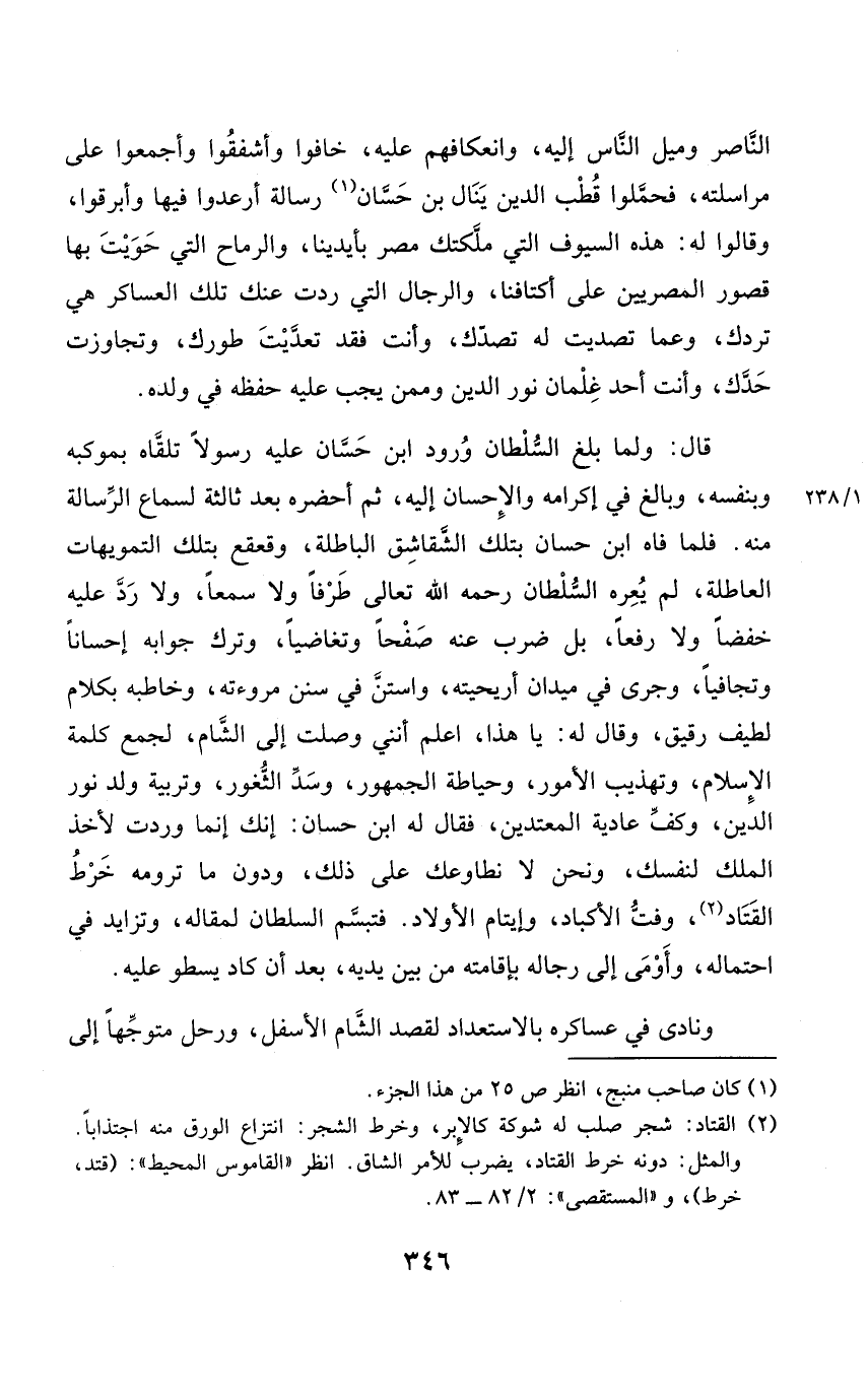 قَالَ وَلما بلغ السُّلْطَان وُرُود ابْن حسان عَلَيْهِ رَسُولا تلّقاه بموكبه وبنفسه وَبَالغ فِي إكرامه وَالْإِحْسَان إِلَيْهِ ثمَّ أحضرهُ بعد ثَالِثَة لسَمَاع الرسَالَة مِنْهُ فَلَمَّا فَاه ابْن حسان بِتِلْكَ الشقاشق الْبَاطِلَة وقعقع بِتِلْكَ التمويهات العاطلة لمُ يُعره السُّلْطَان رَحمَه الله تَعَالَى طرفا وَلَا سمعا وَلَا رد عَلَيْهِ خفضا وَلَا رفعا بل ضرب عَنهُ صفحا وتغاضيا وَترك جَوَابه إحسانا وتجافيا وَجرى فِي ميدان أريحيته واستن فِي سنَن مروءئه وخاطبه بِكَلَام لطيف رَقِيق وَقَالَ لَهُ يَا هَذَا اعْلَم أنني وصلت إِلَى الشَّام لجمع كلمة الْإِسْلَام وتهذيب الْأُمُور وحياطة الْجُمْهُور وسدّ الثغور وتربية ولد نور الدّين وكف عَادِية الْمُعْتَدِينَ فَقَالَ لَهُ ابْن حسان إِنَّك إِنَّمَا وَردت لأخذ الْملك لنَفسك وَنحن لَا نطاوعك على ذَلِك وَدون مَا ترومه خرط القتاد وفتّ الأكباد وإيتام الْأَوْلَاد فَتَبَسَّمَ السُّلْطَان لمقاله وتزايد فِي احْتِمَاله وَأَوْمى إِلَى رِجَاله بإقامته من بَين يَدَيْهِ بعد أَن كَاد يَسْطُو عَلَيْهِ