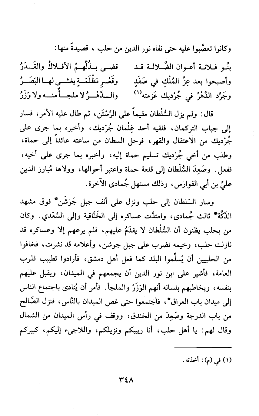 وَسَار السُّلْطَان إِلَى حلب وَنزل على أنف جبل جوشن فَوق مشْهد الدكة ثَالِث جُمَادَى وامتدت عساكره إِلَى الخناقية وَإِلَى السعدى وَكَانَ من بحلب يظنون أَن السُّلْطَان لَا يقدم عَلَيْهِم فَلم يرعهم إِلَّا وعساكره قد نازلت حلب وخيمه تضرب على جبل جوشن وأعلامه قد نشرت فخافوا من الحلبيين أَن يسلمُوا الْبَلَد كَمَا فعل أهل دمشق فأرادوا تطييب قُلُوب الْعَامَّة فأشير على ابْن نور الدّين أَن يجمعهُمْ فِي الميدان وَيقبل عَلَيْهِم بِنَفسِهِ ويخاطبهم بِلِسَانِهِ أَنهم الْوَزَرُ والملجأ فَأمر أَن يُنَادى باجتماع النَّاس إِلَى ميدان بَاب الْعرَاق فَاجْتمعُوا حَتَّى غصّ الميدان بِالنَّاسِ فَنزل الصَّالح من بَاب الدرجَة وَصعد من الخَنْدَق ووقف فِي رَأس الميدان من الشمَال وَقَالَ لَهُم يَا أهل حلب أَنا ربيبكم ونزيلكم واللاجئ إِلَيْكُم كبيركم