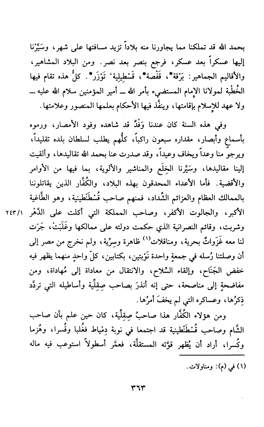 وَفِي هَذِه السّنة كَانَ عندنَا وفْدُ قد شَاهده وُفُود الْأَمْصَار ورموه بأسماع وأبصار مِقْدَاره سَبْعُونَ رَاكِبًا كلّهم يطْلب لسلطان بَلَده تقليدا ويرجو منا وَعدا وَيخَاف وعيدا وَقد صدرت عَنَّا بِحَمْد الله تقاليدها وألقيت إِلَيْنَا مقاليدها وسيَّرنا الْخلْع والمناشير والألوية بِمَا فِيهَا من الْأَوَامِر والأقضية فَأَما الْأَعْدَاء المحدقون بِهَذِهِ الْبِلَاد وَالْكفَّار الَّذين يقاتلوننا بالممالك الْعِظَام والعزائم الشّداد فَمنهمْ صَاحب قسطنطينية وَهُوَ الطاغية الْأَكْبَر والجالوت الأكفر وَصَاحب المملكة الَّتِي أكلت على الدّهر وشربت وقائم النَّصْرَانِيَّة الذّي حكمت دولته على ممالكها وغلبت جَرَت لنا مَعَه غزوات بحريّة ومناقلات ظَاهِرَة وسّرية وَلم نخرج من مصر إِلَى أَن وصلتنا رسله فِي جُمُعَة وَاحِدَة نَوْبتين بكتابين كلّ واحدٍ مِنْهُمَا يظْهر فِيهِ خفض الْجنَاح وإلقاء السِّلَاح والانتقال من معاداة إِلَى مهاداة وَمن مفاضحة إِلَى مناصحة حَتَّى إِنَّه أنذر بِصَاحِب صقلية وأساطليه الَّتِي ترّدد ذكرهَا وعساكره الَّتِي لم يخف أمرهَا