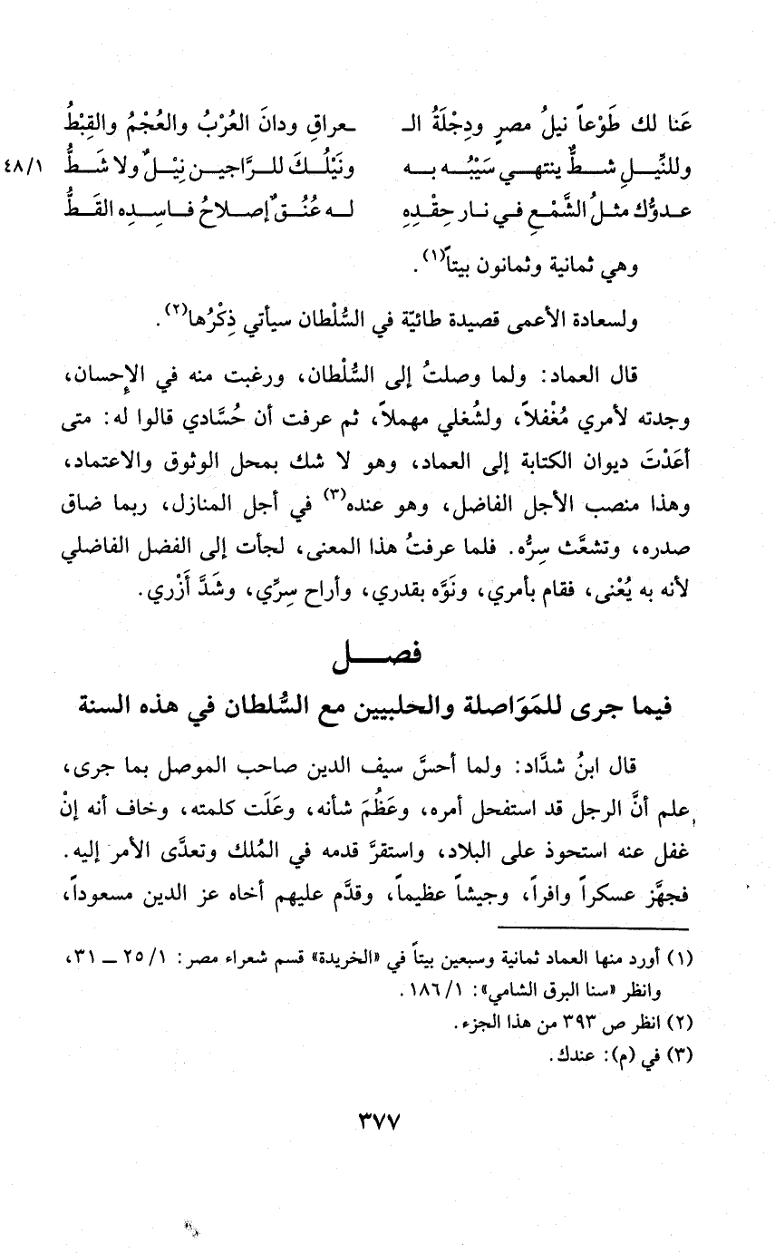 قَالَ الْعِمَاد وَلما وصلتُ إِلَى السُّلْطَان ورغبت مِنْهُ فِي الْإِحْسَان وجدته لأمري مغفلا ولشغلي مهملا ثمَّ عرفت أنّ حسّادي قَالُوا لَهُ مَتى أعدت ديوَان الْكِتَابَة إِلَى الْعِمَاد وَهُوَ لَا شكّ بِمحل الوثوق والاعتماد وَهَذَا منصب الْأَجَل الْفَاضِل وَهُوَ عِنْده فِي أجل الْمنَازل رُبمَا ضَاقَ صَدره وتشعّث سرّه فَلَمَّا عرفت هَذَا الْمَعْنى لجأت إِلَى الْفضل الفاضليّ لِأَنَّهُ بِهِ يعْنى فَقَامَ بأَمْري ونوّه بقدري وأراح سرّي وشدّ أزري