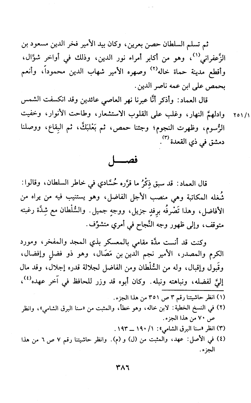 قَالَ الْعِمَاد وأذكر أنَّا عبرنا نهر العَاصِي عائدين وَقد انكسفت الشَّمْس وادلّهم النَّهَار وَغلب على الْقُلُوب الاستشعار وطاحت الْأَنْوَار وخفيت الرّسوم وَظَهَرت النُّجُوم وَجِئْنَا حمص ثمَّ بعلبك ثمَّ الْبِقَاع ووصلنا دمشق فِي ذِي الْقعدَة