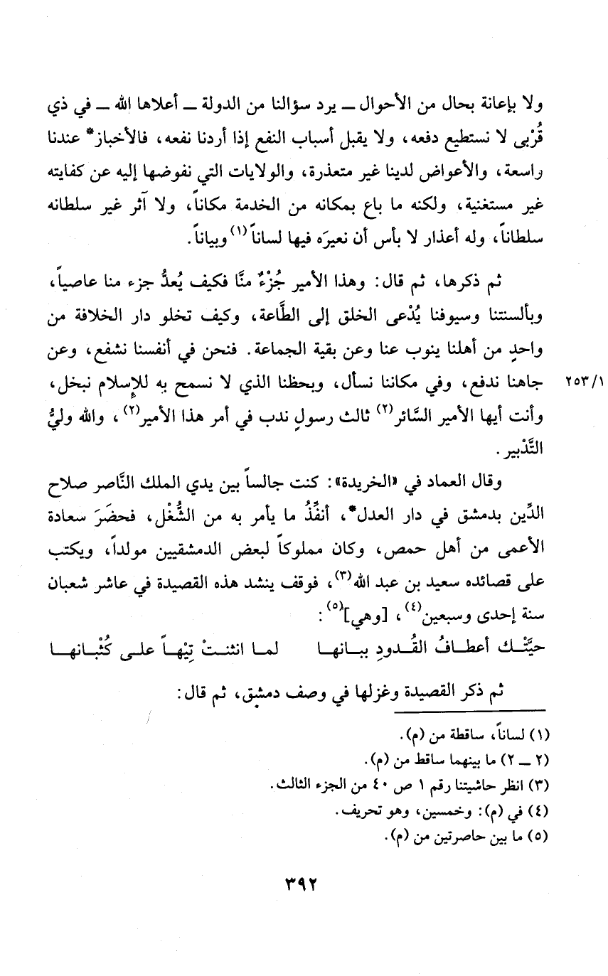 وَقَالَ الْعِمَاد فِي الخريدة كنت جَالِسا بَين يَدي الْملك النَّاصِر صَلَاح الدِّين بِدِمَشْق فِي دَار الْعدْل أنفذُ مَا يَأْمر بِهِ من الشّغل فَحَضَرَ سَعَادَة الْأَعْمَى من أهل حمص وَكَانَ مَمْلُوكا لبَعض الدمشقيين مولدا وَيكْتب على قصائده سعيد بن عبد الله فَوقف ينشد هَذِه القصيدة فِي عَاشر شعْبَان سنة إِحْدَى وَسبعين وَهِي