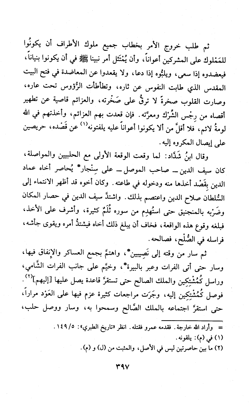 ثمَّ طلب خُرُوج الْأَمر بخطاب جَمِيع مُلُوك الْأَطْرَاف أَن يَكُونُوا للمملوك على الْمُشْركين أعوانا وَأَن يمتثل أَمر نَبينَا صلى الله عَلَيْهِ وَسلم فِي أَن يَكُونُوا بنيانا فيعضدوه إِذا سعى ويلبوه إِذا دَعَا وَلَا يقعدوا عَن المعاضدة فِي فتح الْبَيْت المقدّس الَّذِي طابت النُّفُوس عَن ثاره وتطأطأت الرؤوس تَحت عاره وَصَارَت الْقُلُوب صَخْرَة لَا ترق على صخرته والعزائم قاصية عَن تَطْهِير أقصاه من رِجْس الشّرك ومعرّته فَإِن قعدت بهم العزائم وأخذتهم فِي الله لومةُ لائم فَلَا أقلّ من أَلا يَكُونُوا أعوانا عَلَيْهِ يلفتونه عَن قَصده حريصين على إِيصَال الْمَكْرُوه إِلَيْهِ