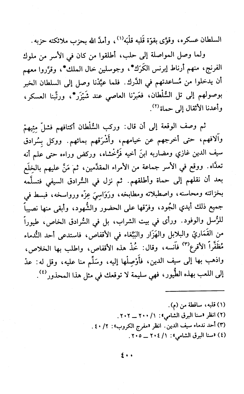 ثمَّ وصف الْوَقْعَة إِلَى أَن قَالَ وَركب السُّلْطَان أكتافهم فشل مِئِيِهْم وآلافهم حَتَّى أخرجهم عَن خيامهم وأشْرَقهم بمائهم ووكل بسرادق سيف الدّين غَازِي ومضاربه ابْن أَخِيه فرخشاه وركض وَرَاءه حَتَّى علم أَنه تعدّاه وَوَقع فِي الْأسر جمَاعَة من الْأُمَرَاء المقدمين ثمَّ مَنَّ عَلَيْهِم بِالْخلْعِ بعد أَن نقلهم إِلَى حماة وأطلقهم ثمّ نزل فِي السرادق السيفي فتسلمه بخزائنه ومحاسنه واصطبلاته ومطابخه وَرَواسي عِزّه ورواسخه فَبسط فِي جَمِيع ذَلِك أَيدي الجُود وفرّقها على الْحُضُور وَالشُّهُود وَأبقى مِنْهَا نَصِيبا للرُّسل والوفود وَرَأى فِي بَيت الشّراب بل فِي السّرادق الخاصّ طيوراً من القماري والبلابل والهزار والببغاء فِي الأقفاص فاستدعى أحد الندماء مظفرا الْأَقْرَع فآنسه وَقَالَ خُذْ هَذِه الأقفاص واطلب بهَا الْخَلَاص واذهب بهَا إِلَى سيف الدّين فأوصلها إِلَيْهِ وسلّم منّا عَلَيْهِ وَقل لَهُ عدْ إِلَى اللّعب بِهَذِهِ الطُّيُور فَهِيَ سليمَة لَا توقعك فِي مثل هَذَا الْمَحْذُور