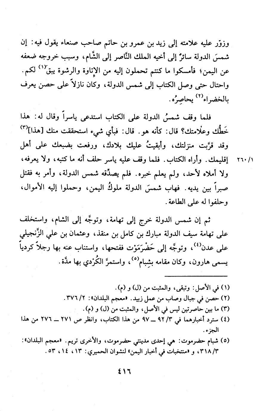 فَلَمَّا وقف شمس الدولة على الْكتاب استدعى ياسراً وَقَالَ لَهُ هَذَا خطك وعلامتك قَالَ كَأَنَّهُ هُوَ قَالَ فَبِأَي شَيْء استحققت مِنْك هَذَا وَقد قرّبت منزلتك وأبقيت عَلَيْك بلادك وَرفعت بضبعك على أهل إقليمك وَأرَاهُ الْكتاب فَلَمَّا وقف عَلَيْهِ يَاسر حلف أَنه مَا كتبه وَلَا يعرفهُ وَلَا أملاه لأحد وَلم يعلم خَبره فَلم يصدقهُ شمس الدولة وَأمر بِهِ فَقتل صبرا بَين يَدَيْهِ فهاب شمس الدولة مُلُوك الْيمن وحملوا إِلَيْهِ الْأَمْوَال وحلفوا لَهُ على الطَّاعَة
