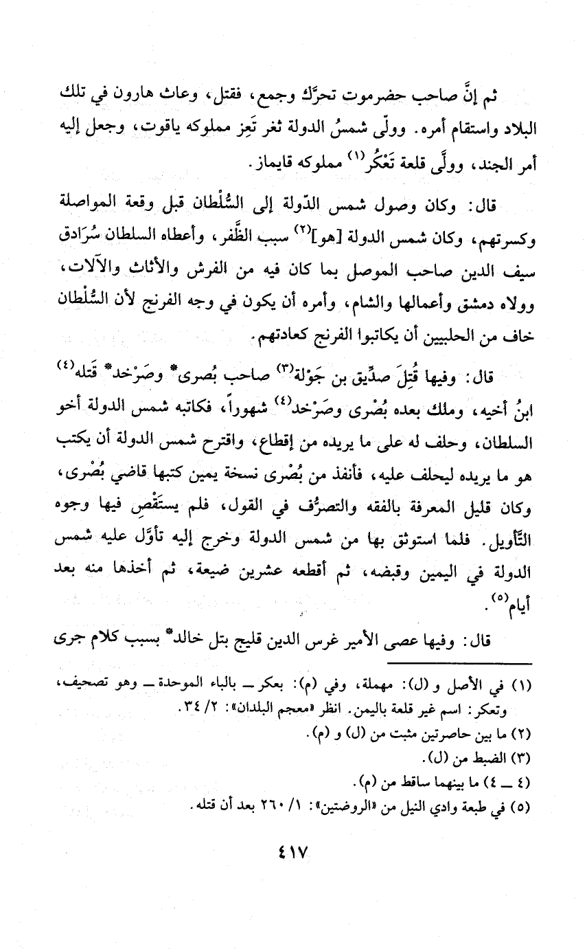 قَالَ وفيهَا قتل صدّيق بن جَوْلَة صَاحب بُصرى وصَرْخد قَتله ابنُ أَخِيه وَملك بعدهُ بُصْرى وصرخد شهورا فكاتبه شمس الدولة أَخُو السُّلْطَان وَحلف لَهُ على مَا يُريدهُ من إقطاع واقترح شمس الدولة أَن يكْتب هُوَ مَا يُريدهُ ليحلف عَلَيْهِ فأنفذ من بُصْرى نُسْخَة يَمِين كتبهَا قَاضِي بصرى وَكَانَ قَلِيل الْمعرفَة بالفقه والتصرّف فِي القَوْل فَلم يستقص فِيهَا وُجُوه التَّأْوِيل فَلَمَّا استوثق بهَا من شمس الدولة وَخرج إِلَيْهِ تأوَّل عَلَيْهِ شمس الدولة فِي الْيَمين وَقَبضه ثمَّ أقطعه عشْرين ضَيْعَة ثمَّ أَخذهَا مِنْهُ بعد أَيَّام