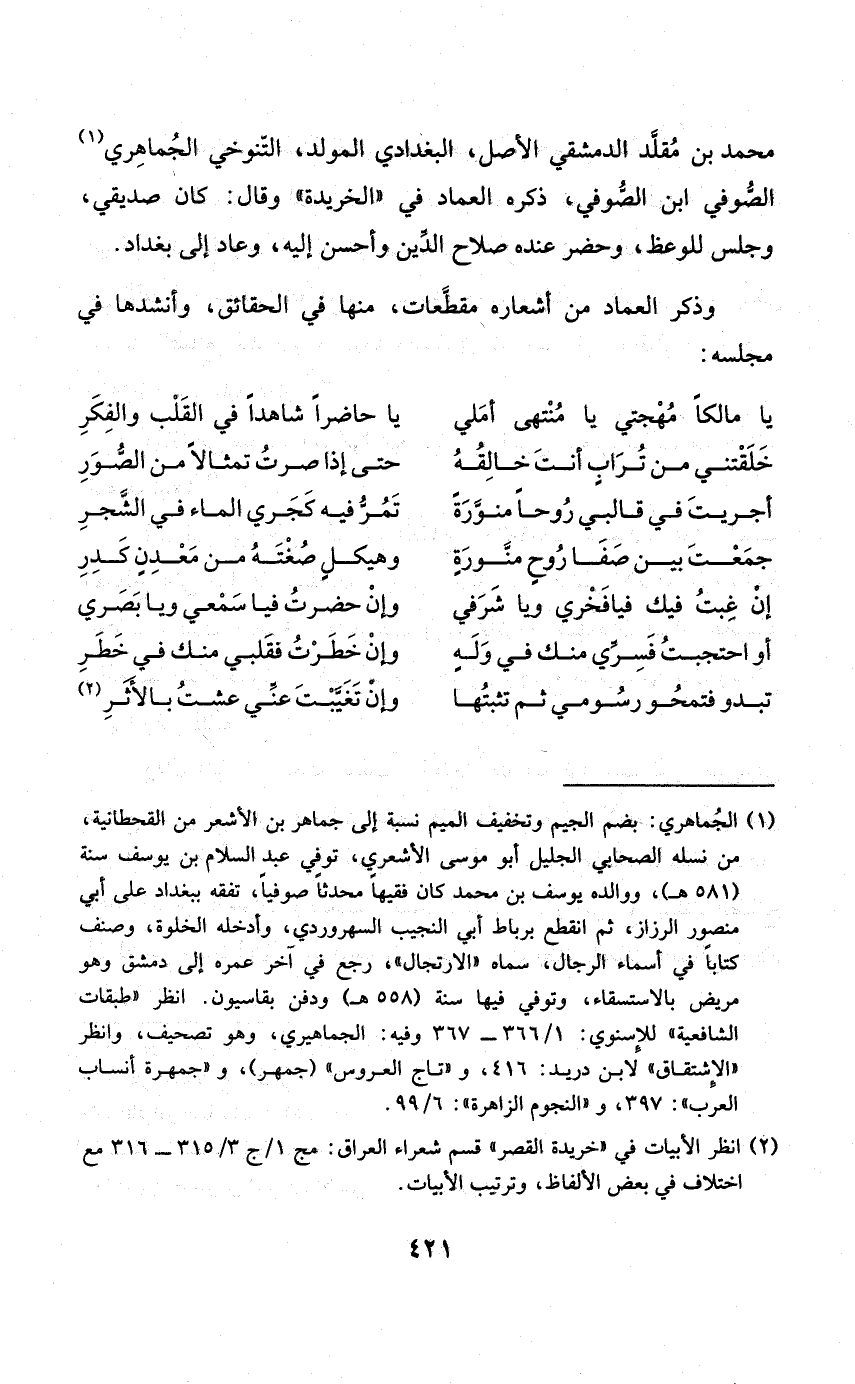 وَذكر الْعِمَاد من أشعاره مقطعات مِنْهَا فِي الْحَقَائِق وأنشدها فِي مَجْلِسه