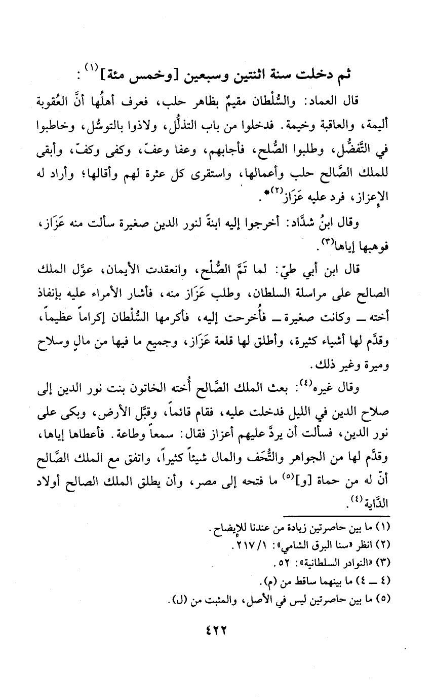 وَقَالَ غَيره بعث الْملك الصَّالح أُخْته الخاتون بنت نور الدّين إِلَى صَلَاح الدّين فِي اللَّيْل فَدخلت عَلَيْهِ فَقَامَ قَائِما وقبّل الأَرْض وَبكى على نور الدّين فَسَأَلت أَن يرد عَلَيْهِم أعزاز فَقَالَ سمعا وَطَاعَة فَأَعْطَاهَا إِيَّاهَا وقدّم لَهَا من الْجَوَاهِر والتحف وَالْمَال شَيْئا كثيرا وَاتفقَ مَعَ الْملك الصَّالح أنّ لَهُ من حماة وَمَا فَتحه إِلَى مصر وَأَن يُطلق الْملك الصَّالح أَوْلَاد الداية