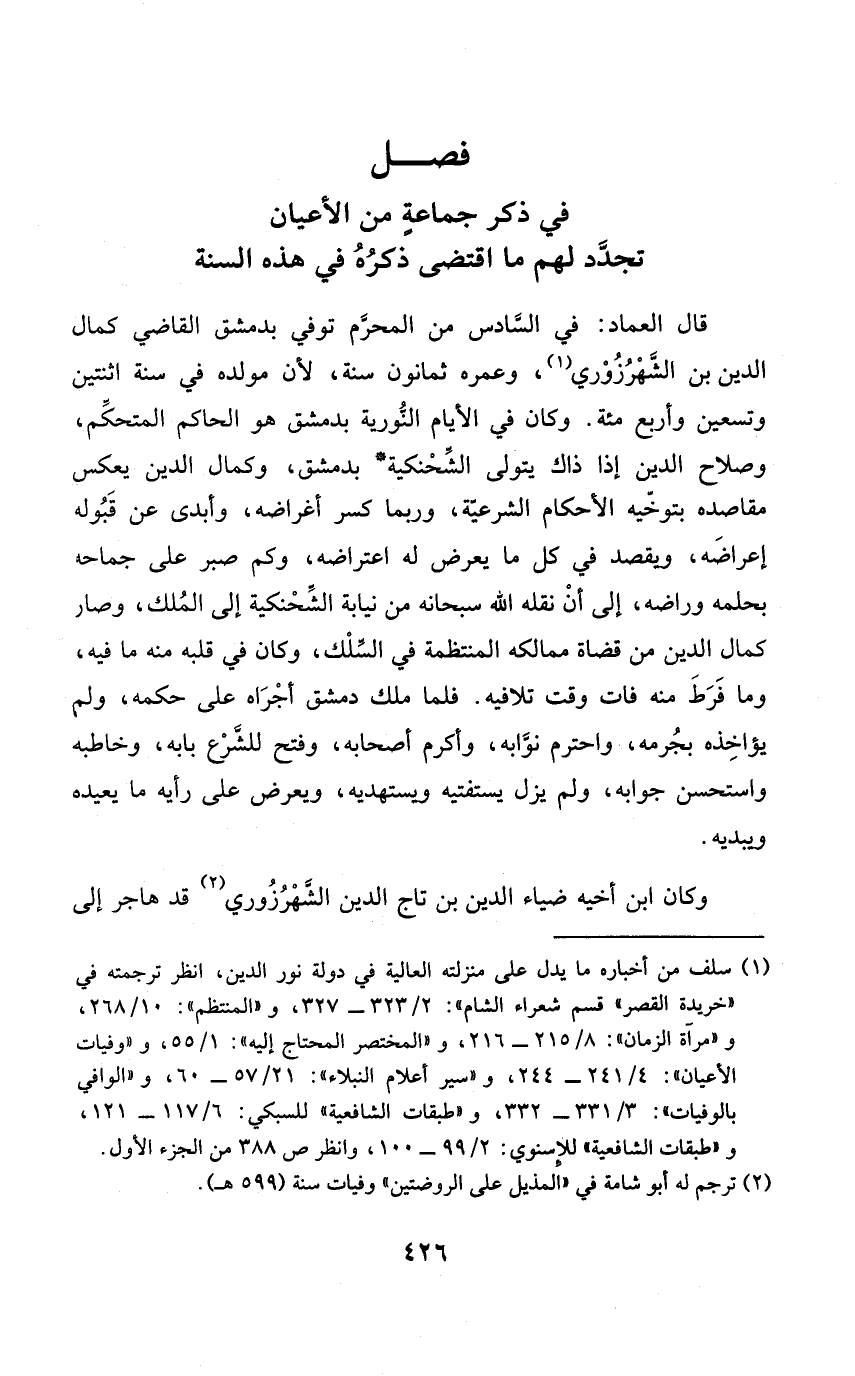 قَالَ الْعِمَاد فِي السَّادِس من المحرّم توفيّ بِدِمَشْق القَاضِي كَمَال الدّين بن الشهرزوري وعمره ثَمَانُون سنة لِأَن مولده فِي سنة اثْنَتَيْنِ وَتِسْعين وَأَرْبع مئة وَكَانَ فِي الْأَيَّام النُّورية بِدِمَشْق هُوَ الْحَاكِم المتحكم وَصَلَاح الدّين إِذا ذَاك يتَوَلَّى الشحنكية بِدِمَشْق وَكَمَال الدّين يعكس مقاصده بتوخيّه الْأَحْكَام الشرّعية وَرُبمَا كسر أغراضه وَأبْدى عَن قبُوله إعراضه ويقصد فِي كلّ مَا يعرض لَهُ اعتراضه وَكم صَبر على جماحه بِحمْلِهِ وراضه إِلَى أنْ نَقله الله سُبْحَانَهُ من نِيَابَة الشحنكية إِلَى المُلك وَصَارَ كَمَال الدّين من قُضَاة ممالكه المنتظمة فِي السلك وَكَانَ فِي قلبه مِنْهُ مَا فِيهِ وَمَا فرط مِنْهُ فَاتَ وَقت تلافيه فَلَمَّا ملك دمشق أجراه على حكمه ولمْ يؤاخذه بجرمه واحترم نوّابه وَأكْرم أَصْحَابه وَفتح للشرّع بَابه وخاطبه وَاسْتحْسن جَوَابه وَلم يزل يستفتيه ويستهديه ويعرض على رَأْيه مَا يُعِيدهُ ويبديه