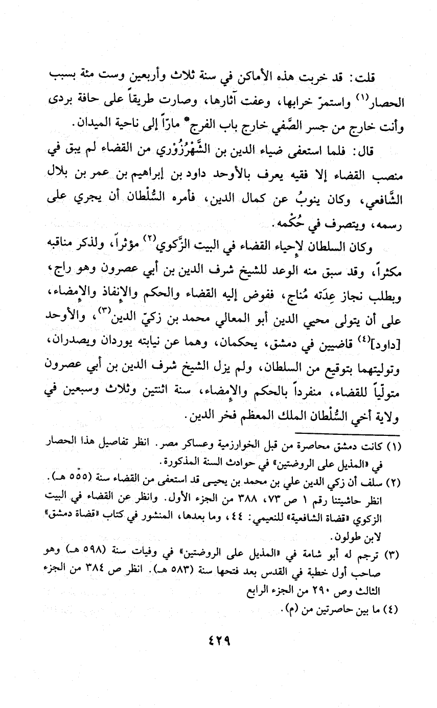 وَكَانَ السُّلْطَان لإحياء الْقَضَاء فِي الْبَيْت الزكوي مؤثرا وَلذكر مناقبه مكثرا وَقد سبق مِنْهُ الْوَعْد للشَّيْخ شرف الدّين بن أبي عصرون وَهُوَ راج وبطلب نجاز عِدَته مناج ففوض إِلَيْهِ الْقَضَاء وَالْحكم والإنفاذ والإمضاء على أَن يتَوَلَّى محيي الدّين أَبُو الْمَعَالِي مُحَمَّد بن زكي الدّين والأوحد دَاوُد قاضيين فِي دمشق يحكمان وهما عَن نيابته يوردان ويصدران وتوليتهما بتوقيع من السُّلْطَان وَلم يزل الشَّيْخ شرف الدّين بن أبي عصرون مُتَوَلِّيًا للْقَضَاء مُنْفَردا بالحكم والإمضاء سنة اثْنَتَيْنِ وَثَلَاث وَسبعين فِي ولَايَة أخي السُّلْطَان الْملك الْمُعظم فَخر الدّين