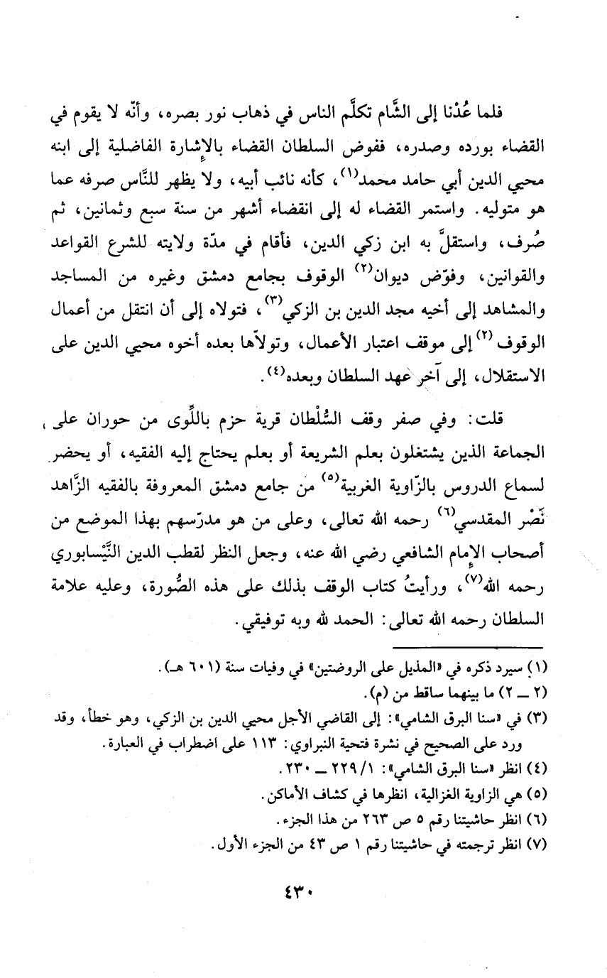 فَلَمَّا عدنا إِلَى الشَّام تكلم النَّاس فِي ذهَاب نور بَصَره وَأَنه لايقوم فِي الْقَضَاء بورده وصدره ففوض السُّلْطَان الْقَضَاء بِالْإِشَارَةِ الْفَاضِلِيَّةِ إِلَى ابْنه محيي الدّين أبي حَامِد مُحَمَّد كَأَنَّهُ نَائِب أَبِيه وَلَا يظْهر للنَّاس صرفه عَمَّا هُوَ متوليه وَاسْتمرّ الْقَضَاء لَهُ إِلَى انْقِضَاء أشهر من سنة سبع وَثَمَانِينَ ثمَّ صُرف واستقلّ بِهِ ابْن زكي الدّين فَأَقَامَ فِي مُدَّة ولَايَته للشَّرْع الْقَوَاعِد والقوانين وفوّض ديوَان الْوُقُوف بِجَامِع دمشق وَغَيره من الْمَسَاجِد والمشاهد إِلَى أَخِيه مجد الدّين بن الزكي فتولاه إِلَى أَن انْتقل من أَعمال الْوُقُوف إِلَى موقف اعْتِبَار الْأَعْمَال وتوّلاها بعده أَخُوهُ محيي الدّين على الِاسْتِقْلَال إِلَى آخر عهد السُّلْطَان وَبعده