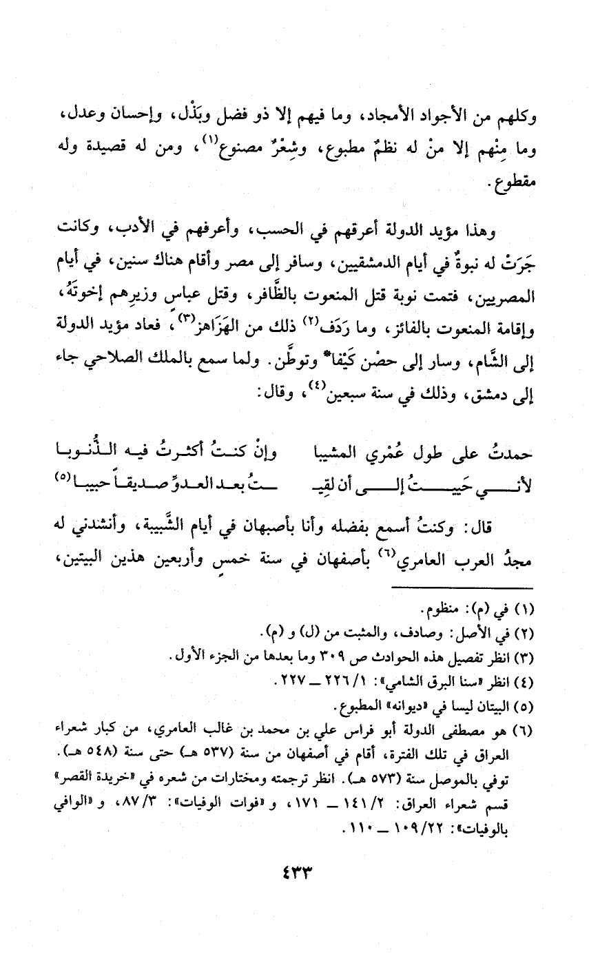 وَهَذَا مؤيد الدولة أعرقهم فِي الْحسب وأعرفهم فِي الْأَدَب وَكَانَت جرت لَهُ نبوة فِي أَيَّام الدمشقيين وسافر إِلَى مصر وَأقَام هُنَاكَ سِنِين فِي أَيَّام المصريين فتمت نوبَة قتل المنعوت بالظافر وَقتل عَبَّاس وزيرهم إخْوَته وَإِقَامَة المنعوت بالفائز وَمَا ردف ذَلِك من الهزاهز فَعَاد مؤيد الدوّلة إِلَى الشَّام وَسَار إِلَى حصن كيفا وتوطن وَلما سمع بِالْملكِ الصلاحيّ جَاءَ إِلَى دمشق وَذَلِكَ فِي سنة سبعين وَقَالَ