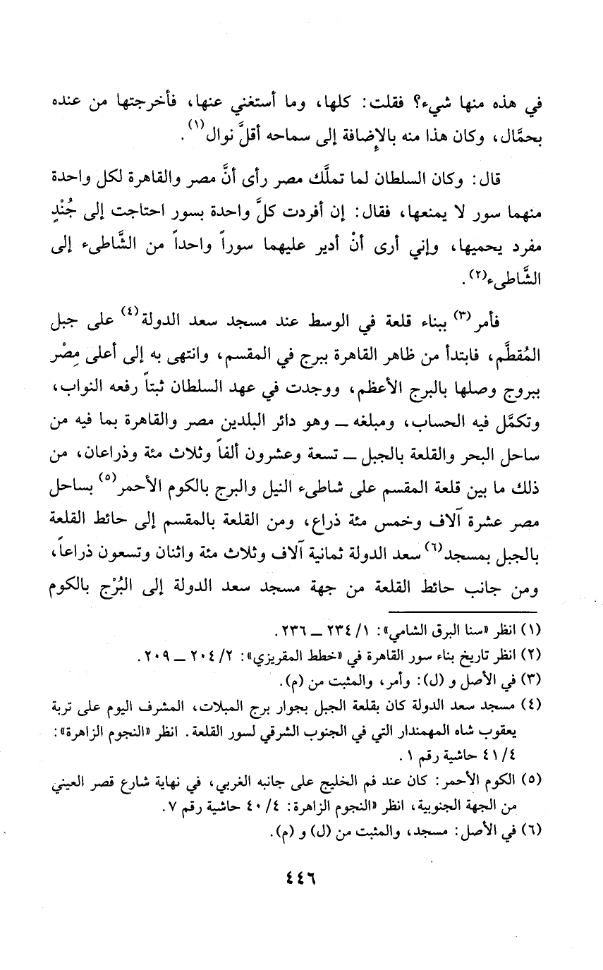 فَأمر بِبِنَاء قلعة فِي الْوسط عِنْد مَسْجِد سعد الدولة على جبل المقطم فابتدأ من ظَاهر الْقَاهِرَة ببرج فِي الْمقسم وانْتهى بِهِ إِلَى أَعلَى مصر ببروج وَصلهَا بالبرج الْأَعْظَم وَوجدت فِي عهد السُّلْطَان ثبتا رَفعه النواب وتكمل فِيهِ الْحساب ومبلغه وَهُوَ دائر البلدين مصر والقاهرة بِمَا فِيهِ من سَاحل الْبَحْر والقلعة بِالْجَبَلِ تِسْعَة وَعِشْرُونَ ألفا وَثَلَاث مئة وذراعان من ذَلِك مَا بَين قلعة الْمقسم على شاطئ النّيل والبرج بالكوم الْأَحْمَر بساحل مصر عشرَة آلَاف وَخمْس مئة ذِرَاع وَمن القلعة بالمقسم إِلَى حَائِط القلعة بِالْجَبَلِ بِمَسْجِد سعد الدولة ثَمَانِيَة آلَاف وَثَلَاث مئة وَاثْنَانِ وَتسْعُونَ ذِرَاعا وَمن جَانب حَائِط القلعة من جِهَة مَسْجِد سعد الدولة إِلَى البرج بالكوم
