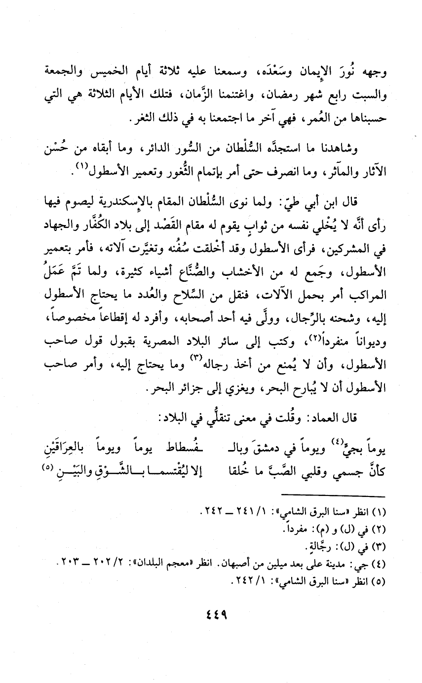 وشاهدنا مَا استجده السُّلْطَان من السُّور الدائر وَمَا أبقاه من حسن الْآثَار والمآثر وَمَا انْصَرف حَتَّى أَمر بإتمام الثغور وتعمير الأسطول