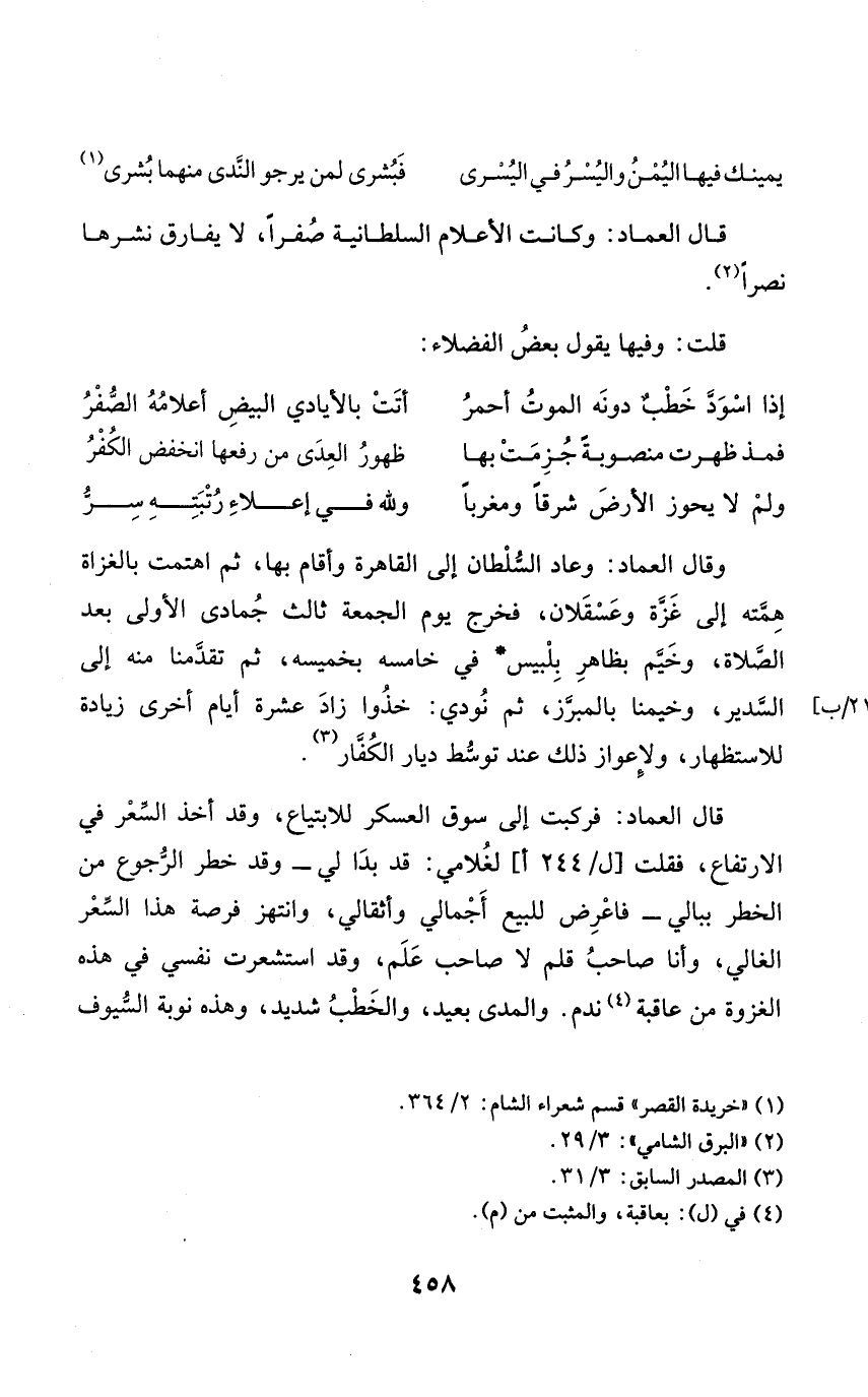 قَالَ الْعِمَاد فركبت إِلَى سوق الْعَسْكَر للابتياع وَقد أَخذ السّعر فِي الِارْتفَاع فَقلت لغلامي قد بدا لي وَقد خطر الرّجوع من الْخطر ببالي فاعرض للْبيع أجمالي وأثقالي وانتهز فرْصَة هَذَا السّعر الغالي وَأَنا صَاحب قلم لَا صَاحب علم وَقد استشعرت نَفسِي فِي هَذِه الْغَزْوَة من عَاقِبَة نَدم والمدى بعيد والخطب شَدِيد وَهَذِه نوبَة السيوف