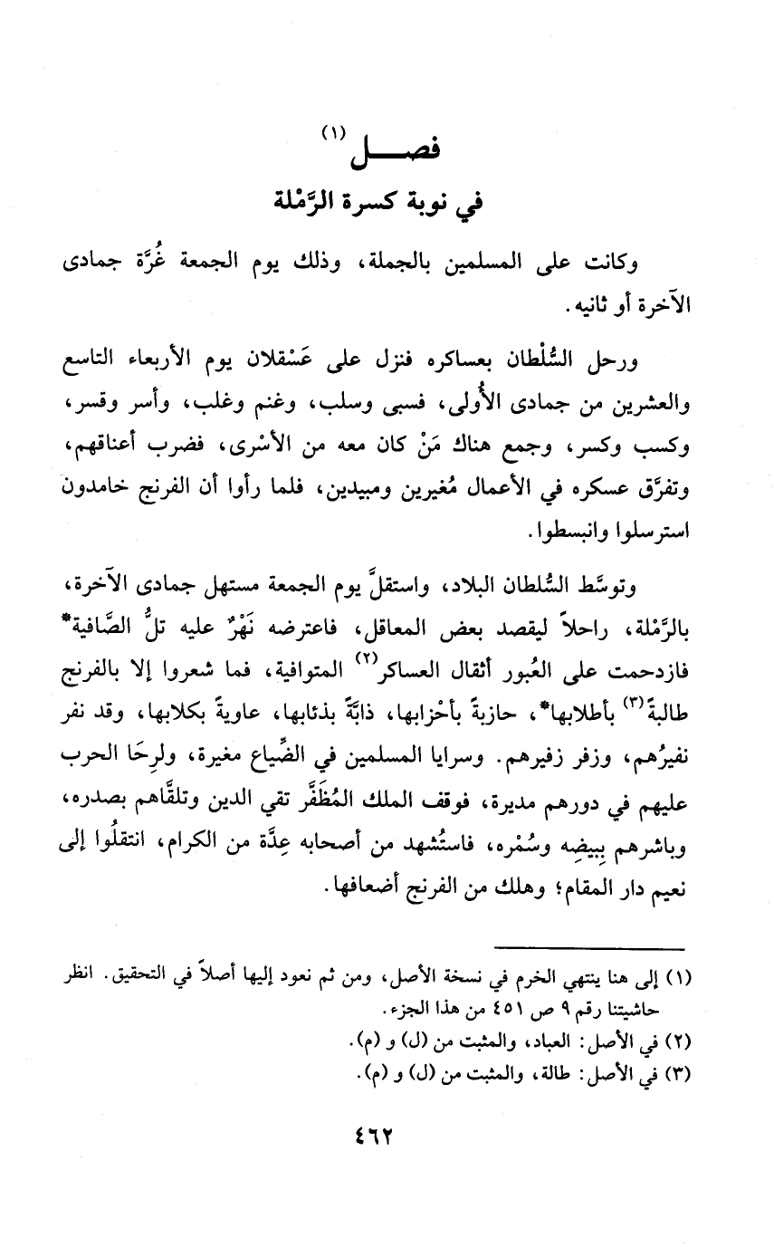 وتوَّسط السُّلطان الْبِلَاد واستقل يَوْم الْجُمُعَة مستهلّ جُمَادَى الْآخِرَة بالرّملة راحلاً ليقصد بعض المعاقل فاعترضه نهرٌ عَلَيْهِ تلّ الصافية فازدحمت على العبور أثقال العساكر المتوافية فَمَا شعروا إِلَّا بالفرنج طالبةً بأطلابها حازبةً بأحزابها ذابَّةً بذئابها عاويةً بكلابها وَقد نفر نفيرهم وَزفر زفيرهم وسرايا الْمُسلمين فِي الضّيَاع مُغيرَة ولرِحا الْحَرْب عَلَيْهِم فِي دُورهمْ مديرة فَوقف الْملك المظفر تَقِيّ الدّين وتلقاهم بصدره وباشرهم ببيضه وسُمره فاستشهد من أَصْحَابه عدَّة من الْكِرَام انتقلوا إِلَى نعيم دَار الْمقَام وَهلك من الفرنج أضعافها