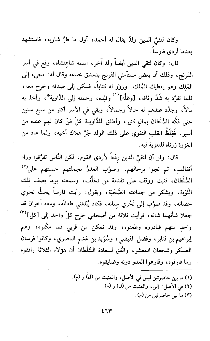 قَالَ وَكَانَ لتقي الدّين أَيْضا ولد آخر اسْمه شاهنشاه وَقع فِي أسر الفرنج وَذَلِكَ أَن بعض مستأمني الفرنج بِدِمَشْق خدعه وَقَالَ لَهُ تَجِيء إِلَى الْملك وَهُوَ يعطيك الْملك وزور لَهُ كتابا فسكن إِلَى صدقه وَخرج مَعَه فَلَمَّا تفرد بِهِ شدّ وثَاقه وغلّه وقيَّده وَحمله إِلَى الداوية وَأخذ بِهِ مَالا وجدد عِنْدهم لَهُ حَالا وجمالا وَبَقِي فِي الْأسر أَكثر من سبع سِنِين حَتَّى فكّه السُّلْطَان بِمَال كثير وَأطلق للداوّية كلّ من كَانَ لَهُم عِنْده من أَسِير فغلط الْقلب التقوّى على ذَلِك الْوَلَد جرّ هَلَاك أَخِيه وَلما عَاد من الْغَزْوَة زرناه للتعزية فِيهِ