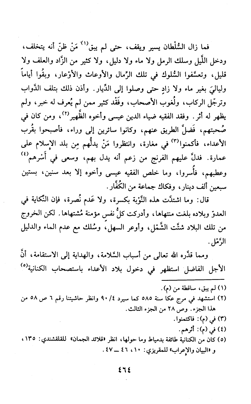 فَمَا زَالَ السُّلْطَان يسير وَيقف حَتَّى لم يبْق من ظنّ أَنه يتَخَلَّف وَدخل اللَّيْل وسلك الرمل وَلَا مَاء وَلَا دَلِيل وَلَا كثير من الزَّاد والعلف وَلَا قَلِيل وتعسفوا السلوك فِي تِلْكَ الرمال والأوعاث والأوعار وبقوا أَيَّامًا وليالي بِغَيْر مَاء وَلَا زَاد حَتَّى وصلوا إِلَى الديار وَأذن ذَلِك بِتَلف الدّواب وترجل الركاب ولُغوب الْأَصْحَاب وفقد كثير مِمَّن لم يعرف لَهُ خبر وَلم يظْهر لَهُ أثر وفقد الْفَقِيه ضِيَاء الدّين عِيسَى وَأَخُوهُ الظهير وَمن كَانَ فِي صُحبتهم فضّل الطَّرِيق عَنْهُم وَكَانُوا سائرين إِلَى وَرَاء فَأَصْبحُوا بِقرب الْأَعْدَاء فأكمنوا فِي مغارة وَانْتَظرُوا من يدلهم من بلد الْإِسْلَام على عمَارَة فدّل عَلَيْهِم الفرنج من زعم أَنه يدل بهم وسعى فِي أسرهم وعطبهم فأسروا وَمَا خلص الْفَقِيه عِيسَى وَأَخُوهُ إِلَّا بعد سِنِين بستين سبعين ألف دِينَار وفكاك جمَاعَة من الْكفَّار