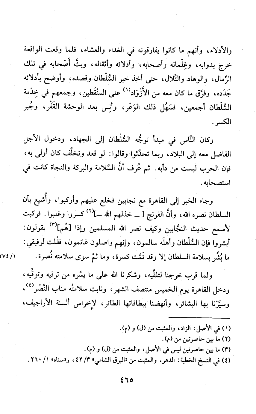 وَكَانَ النَّاس فِي مبدأ توجُّه السُّلْطَان إِلَى الْجِهَاد وَدخُول الْأَجَل الْفَاضِل مَعَه إِلَى الْبِلَاد رُبمَا تحدثُوا وَقَالُوا لَو قعد وتخلف كَانَ أولى بِهِ فَإِن الْحَرْب لَيست من دأبه ثمّ عُرف أنّ السَّلامة وَالْبركَة والنجاة كَانَت فِي استصحابه
