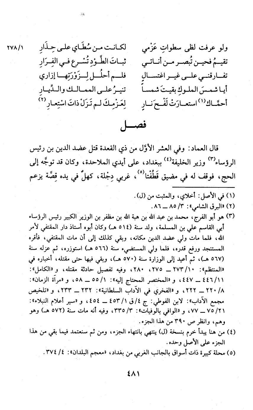 قَالَ الْعِمَاد وَفِي الْعشْر الأول من ذِي الْقعدَة قتل عضد الدّين بن رَئِيس الرؤساء وَزِير الْخَلِيفَة بِبَغْدَاد على أَيدي الْمَلَاحِدَة وَكَانَ قد توجه إِلَى الْحَج فَوقف لَهُ فِي مضيق قطفتا غربي دجلة كهلٌ فِي يَده قصّة يزْعم