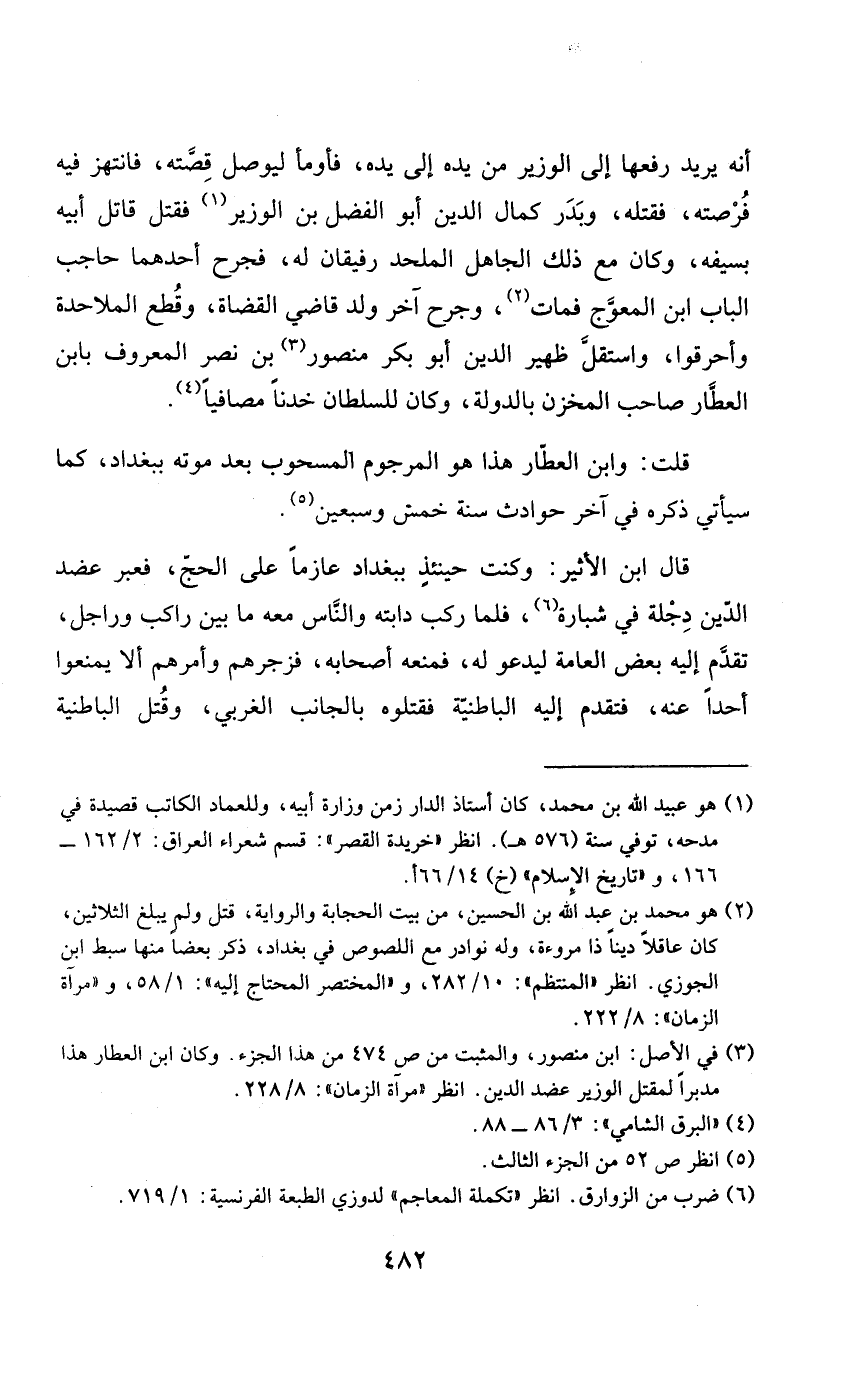 أَنه يُرِيد رَفعهَا إِلَى الْوَزير من يَده إِلَى يَده فَأَوْمأ ليوصل قصَّته فانتهز فِيهِ فرصته فَقتله وَبدر كَمَال الدّين أَبُو الْفضل بن الْوَزير فَقتل قَاتل أَبِيه بِسَيْفِهِ وَكَانَ مَعَ ذَلِك الْجَاهِل الملحد رفيقان لَهُ فجرح أَحدهمَا حَاجِب الْبَاب ابْن المعوج فَمَاتَ وجرح آخر ولد قَاضِي الْقُضَاة وَقطع الْمَلَاحِدَة وأحرقوا واستقلَّ ظهير الدّين أَبُو بكر مَنْصُور بن نصر الْمَعْرُوف بِابْن الْعَطَّار صَاحب المخزن بالدولة وَكَانَ للسُّلْطَان خدنا مصافيا