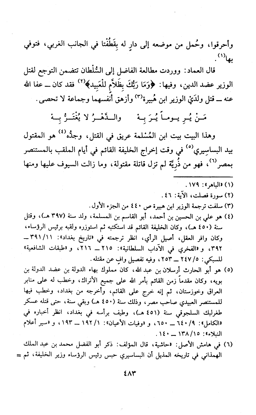 قَالَ الْعِمَاد ووردت مطالعة الْفَاضِل إِلَى السُّلْطَان تَتَضَمَّن التوجع لقتل الْوَزير عضد الدّين وفيهَا {وَمَا رَبك بِظَلاَّمٍ للعْبيِد} فقد كَانَ عَفا الله عَنهُ قتل وَلَدي الْوَزير ابْن هُبَيْرَة وأزهق أَنفسهمَا وَجَمَاعَة لَا تحصى
