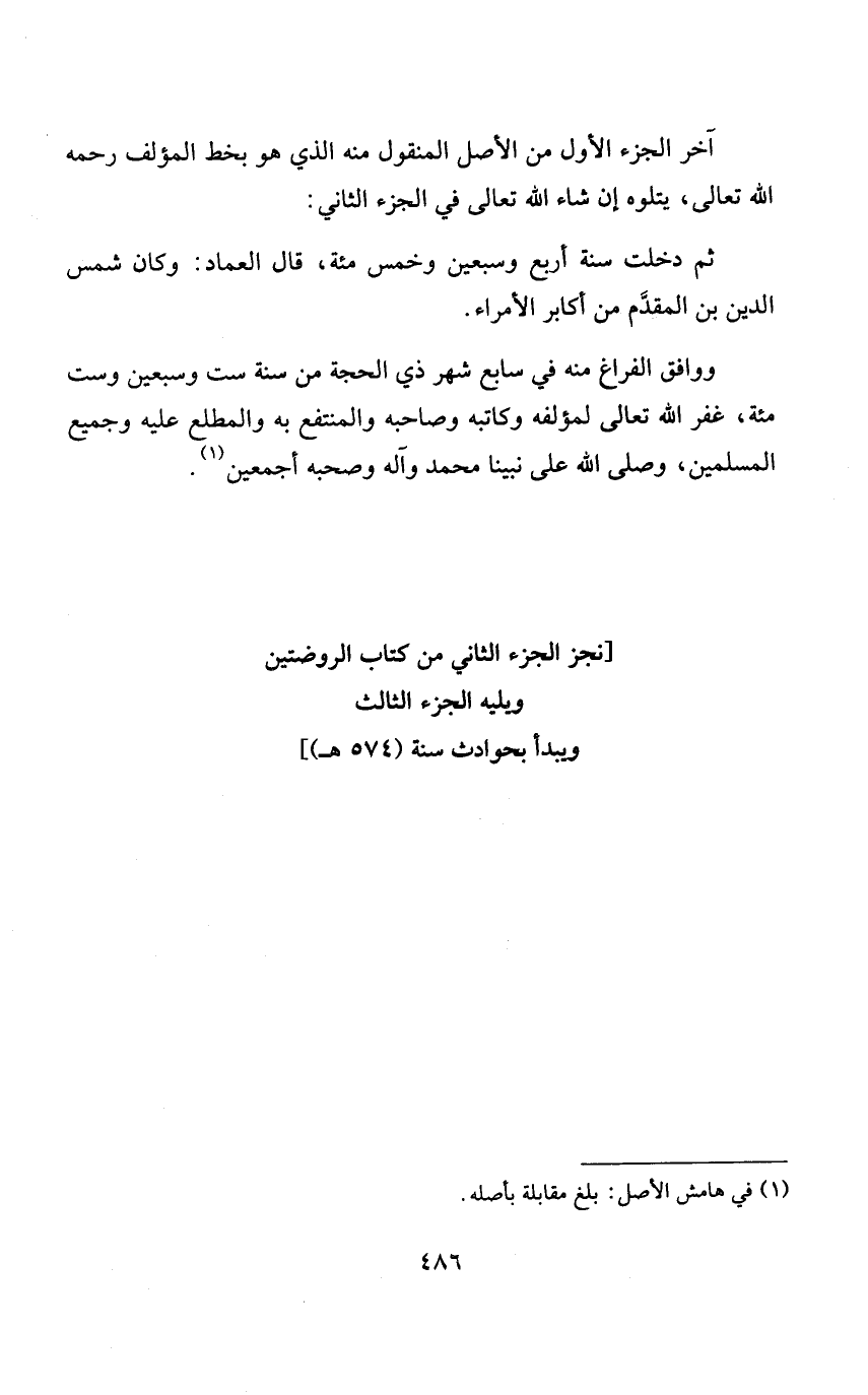 وَوَافَقَ الْفَرَاغ مِنْهُ فِي سَابِع شهر ذِي الْحجَّة من سنة سِتّ وَسبعين وست مئة غفر الله تَعَالَى لمؤلفه وكاتبه وَصَاحبه والمنتفع بِهِ والمطلع عَلَيْهِ وَجَمِيع الْمُسلمين وَصلى الله على نَبينَا مُحَمَّد وَآله وَصَحبه أَجْمَعِينَ [نجزء الْجُزْء الثَّانِي من كتاب الروضتين ويليه الْجُزْء الثَّالِث وَيبدأ بحوادث سنة (574 هـ)]