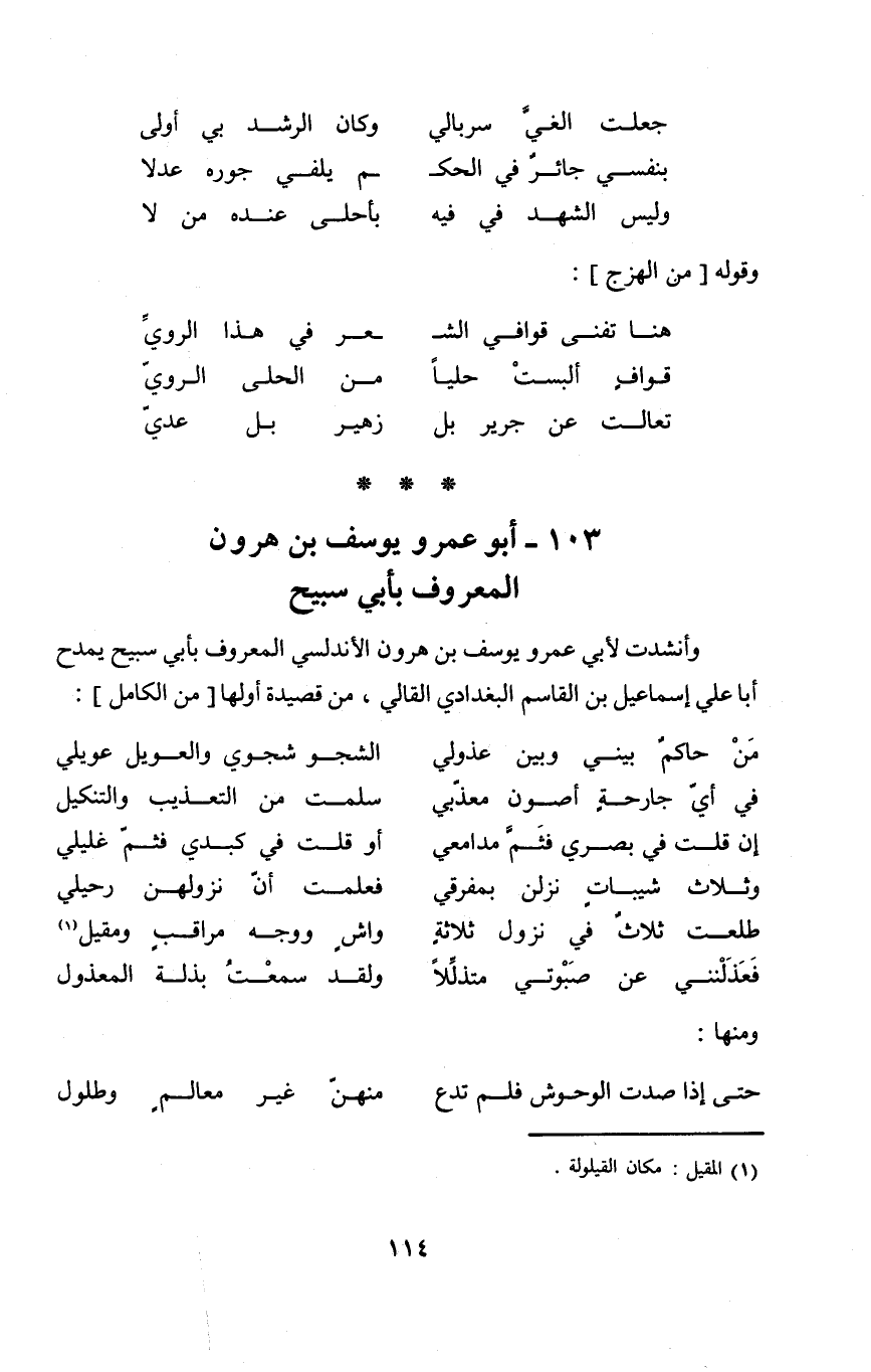وأنشدت لأبي عَمْرو يُوسُف بن هرون الاندلسي الْمَعْرُوف بِأبي سبيح يمدح أَبَا عَليّ إِسْمَاعِيل بن الْقَاسِم الْبَغْدَادِيّ القالي من قصيدة أَولهَا من الْكَامِل