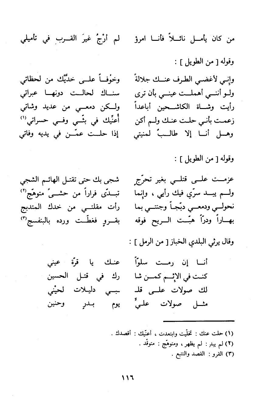 (زعمت بِأَنِّي حلت عَنْك وَلم أكن ... أعنيك فِي بثي وَفِي حسراتي)