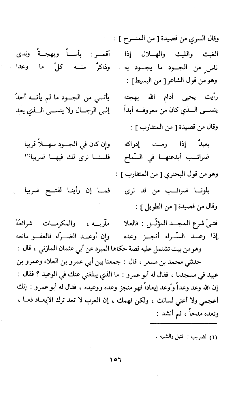 حَدثنِي مُحَمَّد بن مسعر قَالَ جَمعنَا بَين ابي عَمْرو بن الْعَلَاء وَعَمْرو بن عبيد فِي مَسْجِدنَا فَقَالَ لَهُ ابو عَمْرو مَا الَّذِي يبلغنِي عَنْك فِي الْوَعيد فَقَالَ إِن الله وعد وَعدا وأوعد إيعادا فَهُوَ منجز وعده ووعيده فَقَالَ لَهُ ابو عَمْرو إِنَّك اعجمي وَلَا أَعنِي لسَانك وَلَكِن فهمك إِن الْعَرَب لَا تعد ترك الايعاد ذما وتعده مدحا ثمَّ انشد