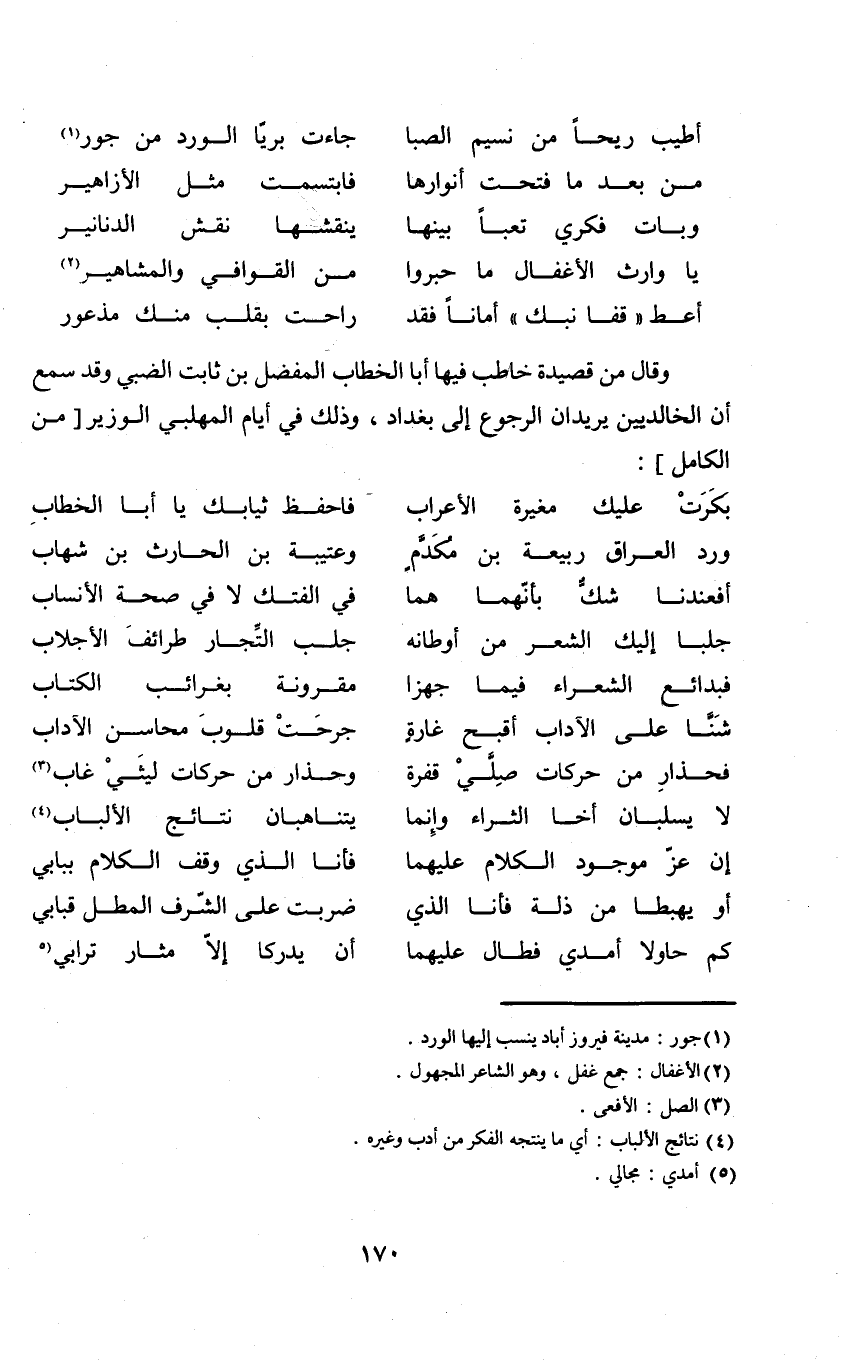 وَقَالَ من قصيدة خَاطب فِيهَا أَبَا الْخطاب الْمفضل بن ثَابت الضَّبِّيّ وَقد سمع ان الخالديين يُريدَان الرُّجُوع إِلَى بَغْدَاد وَذَلِكَ فِي ايام المهلبي الْوَزير من الْكَامِل