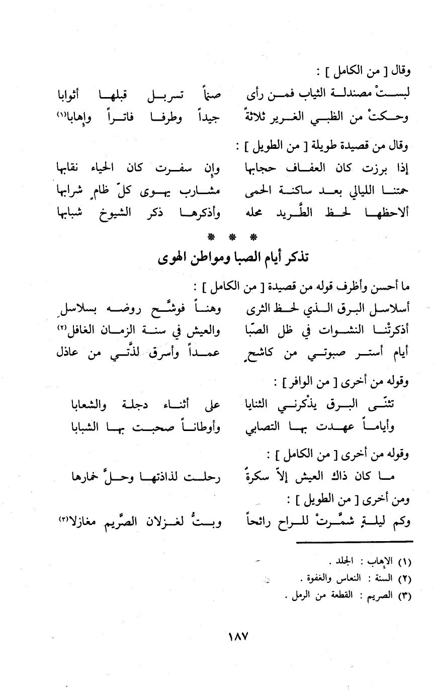 (وأياما عهِدت بهَا التصابي ... وأوطانا صَحِبت بهَا الشبابا) // الوافر //