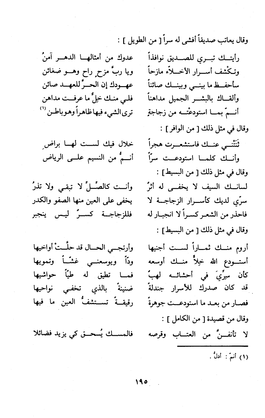 (أنم بِمَا استودعته من زجاجة ... ترى الشَّيْء فِيهَا ظَاهرا وَهُوَ بَاطِن) // الطَّوِيل //