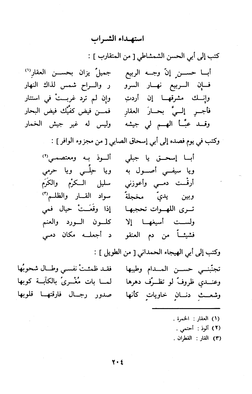 (ابا حسن إِن وَجه الرّبيع ... جميل يزان بِحسن الْعقار)